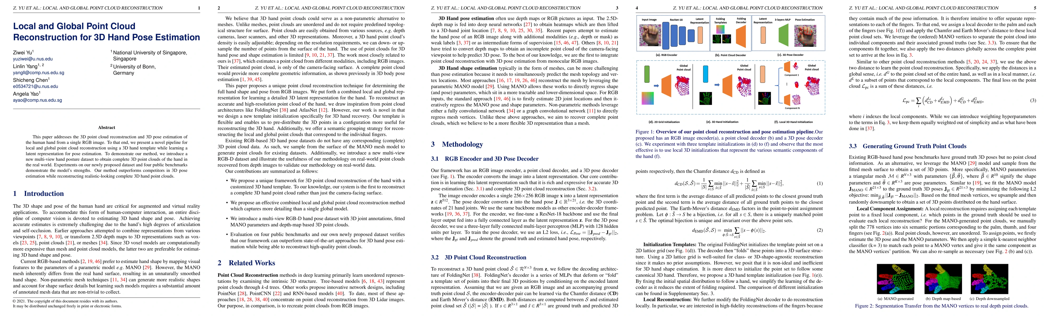 This paper proposes a novel pipeline for reconstructing local and global 3D point clouds of the human hand from a single RGB image, utilizing a 3D hand template and a latent representation for pose estimation. The method is validated on a newly created multi-view hand posture dataset and outperforms competitors in 3D pose estimation.