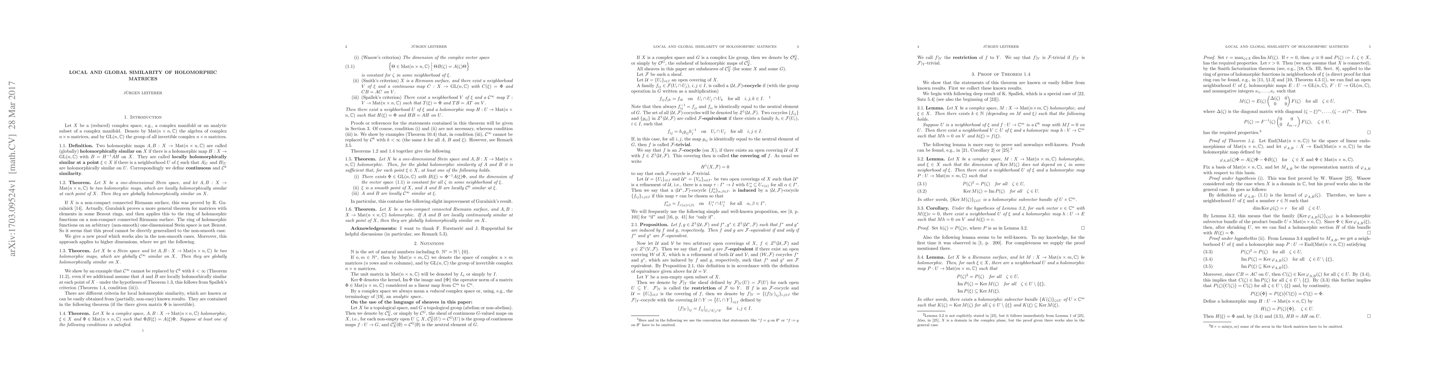 R. Guralnick (Linear Algebra Appl. 99, 85-96, 1988) proved that two holomorphic matrices on a noncompact connected Riemann surface, which are locally holomorphically similar, are globally holomorphically similar. We generalize this to (possibly, non-smooth) one-dimensional Stein spaces. For Stein spaces of arbitrary dimension, we prove that global $\mathcal C^\infty$ similarity implies global holomorphic similarity, whereas global continuous similarity is not sufficient.
