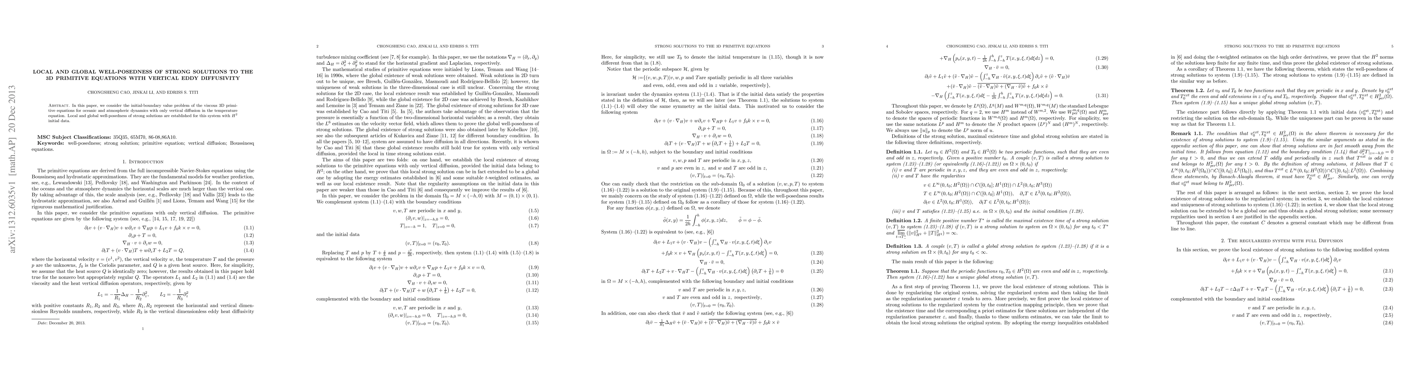 This paper establishes local and global well-posedness of strong solutions for the 3D viscous primitive equations with vertical eddy diffusivity, demonstrating the system's stability for $H^2$ initial data. The focus is on oceanic and atmospheric dynamics with only vertical diffusion in the temperature equation.