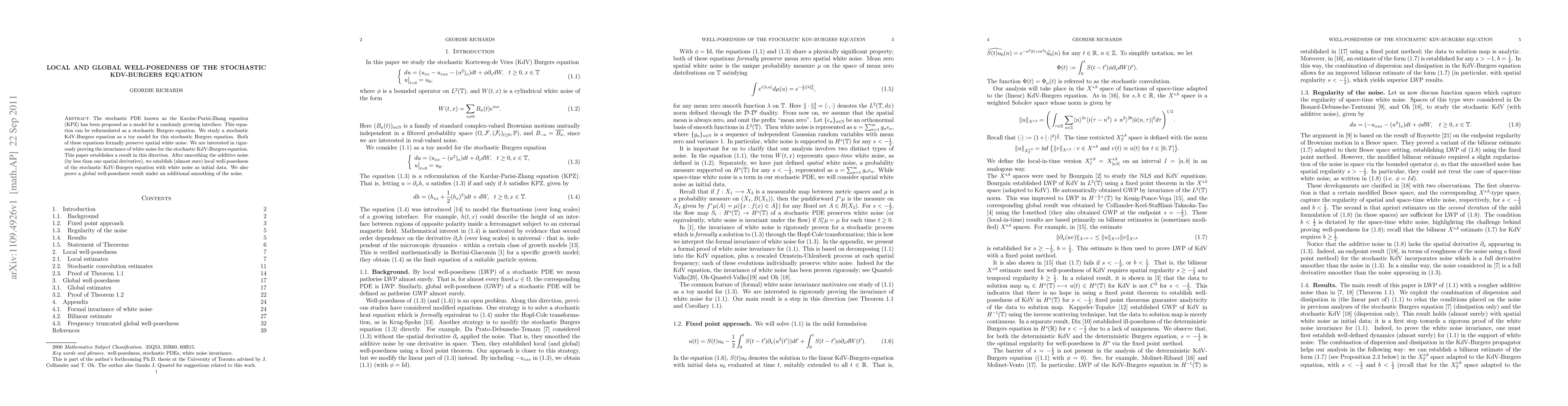This paper investigates the local and global well-posedness of the stochastic KdV-Burgers equation, a reformulation of the Kardar-Parisi-Zhang equation, establishing local well-posedness under slight noise smoothing and global well-posedness with further noise smoothing.