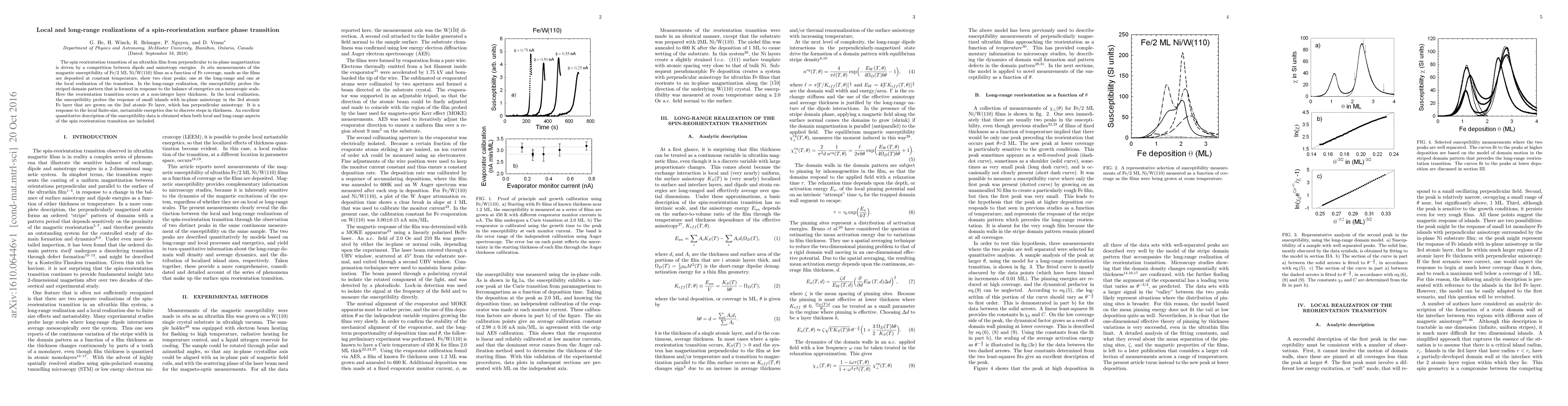 The spin reorientation transition of an ultrathin film from perpendicular to in-plane magnetization is driven by a competition between dipole and anisotropy energies. \textit{In situ} measurements of the magnetic susceptibility of Fe/2 ML Ni/W(110) films as a function of Fe coverage, made as the films are deposited at constant temperature, show two clear peaks; one at the long-range and one at the local realization of the transition. In the long-range realization, the susceptibility probes the striped domain pattern that is formed in response to the balance of energetics on a mesoscopic scale. Here the reorientation transition occurs at a non-integer layer thickness. In the local realization, the susceptibility probes the response of small islands with in-plane anisotropy in the 3rd atomic Fe layer that are grown on the 2nd atomic Fe layer, which has perpendicular anisotropy. It is a response to the local finite-size, metastable energetics due to discrete steps in thickness. An excellent quantitative description of the susceptibility data is obtained when both local and long-range aspects of the spin reorientation transition are included.
