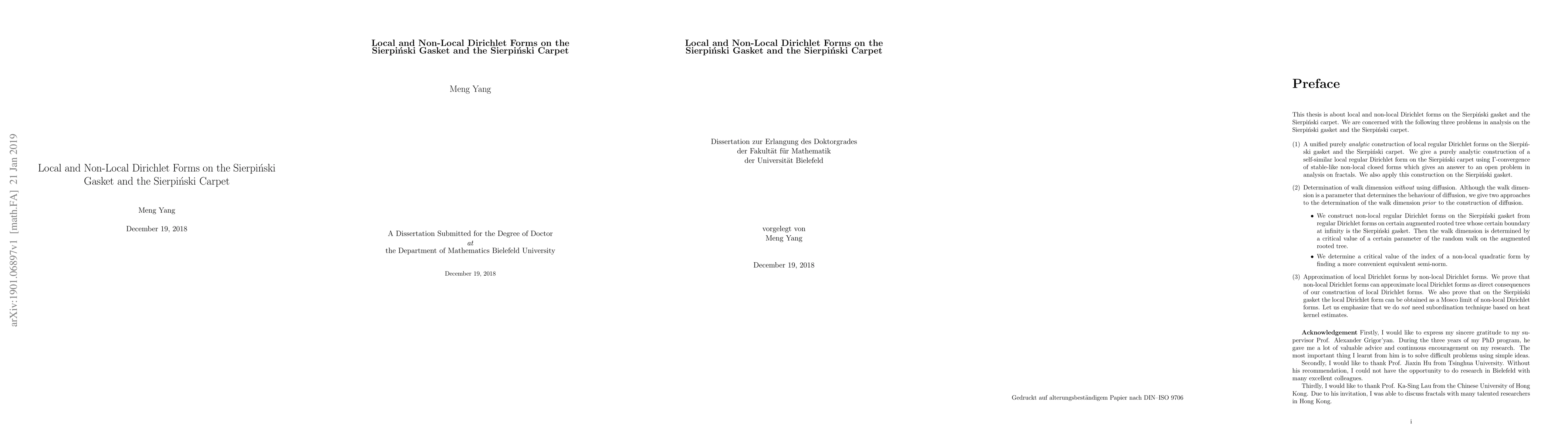 This paper presents an analytic construction of local regular Dirichlet forms on the Sierpiński gasket and carpet, determines the walk dimension independently of diffusion, and demonstrates that non-local Dirichlet forms can approximate local ones, with a specific focus on the Sierpiński gasket.
