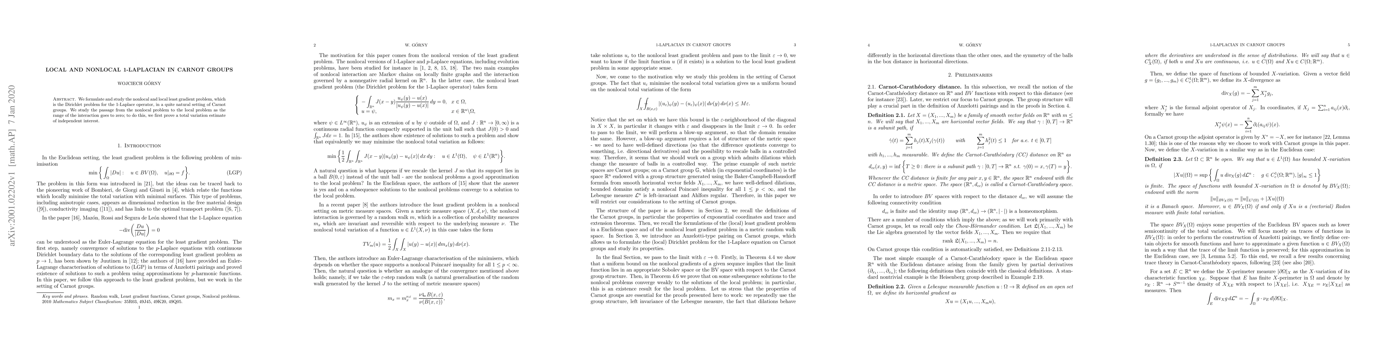 We formulate and study the nonlocal and local least gradient problem, which is the Dirichlet problem for the 1-Laplace operator, in a quite natural setting of Carnot groups. We study the passage from the nonlocal problem to the local problem as the range of the interaction goes to zero; to do this, we first prove a total variation estimate of independent interest.