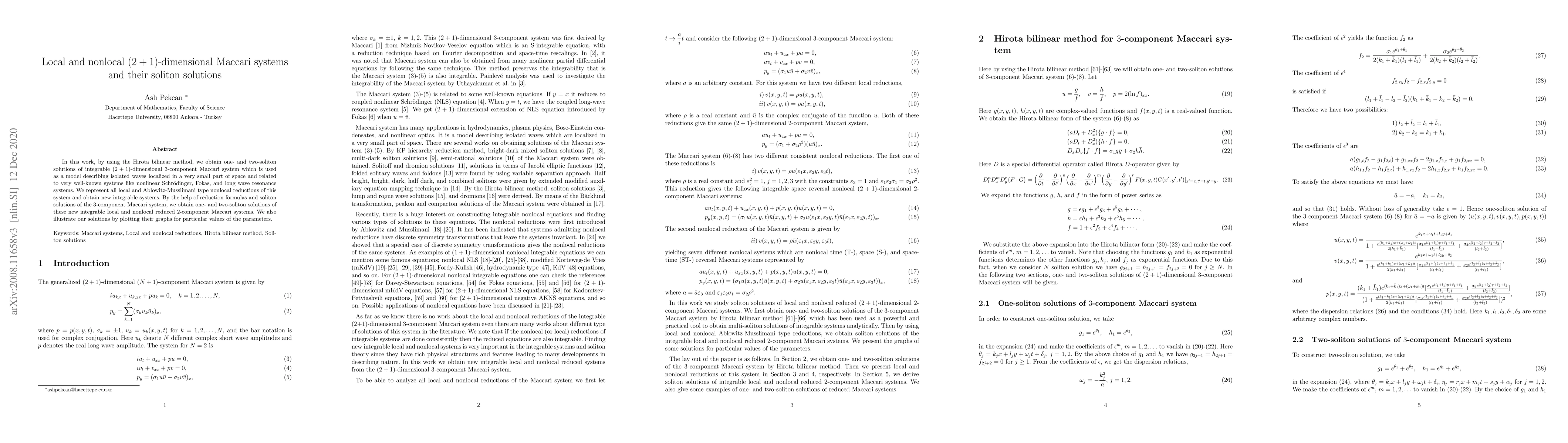 In this work, by using the Hirota bilinear method, we obtain one- and two-soliton solutions of integrable $(2+1)$-dimensional $3$-component Maccari system which is used as a model describing isolated waves localized in a very small part of space and related to very well-known systems like nonlinear Schr\"{o}dinger, Fokas, and long wave resonance systems. We represent all local and Ablowitz-Musslimani type nonlocal reductions of this system and obtain new integrable systems. By the help of reduction formulas and soliton solutions of the $3$-component Maccari system, we obtain one- and two-soliton solutions of these new integrable local and nonlocal reduced $2$-component Maccari systems. We also illustrate our solutions by plotting their graphs for particular values of the parameters.