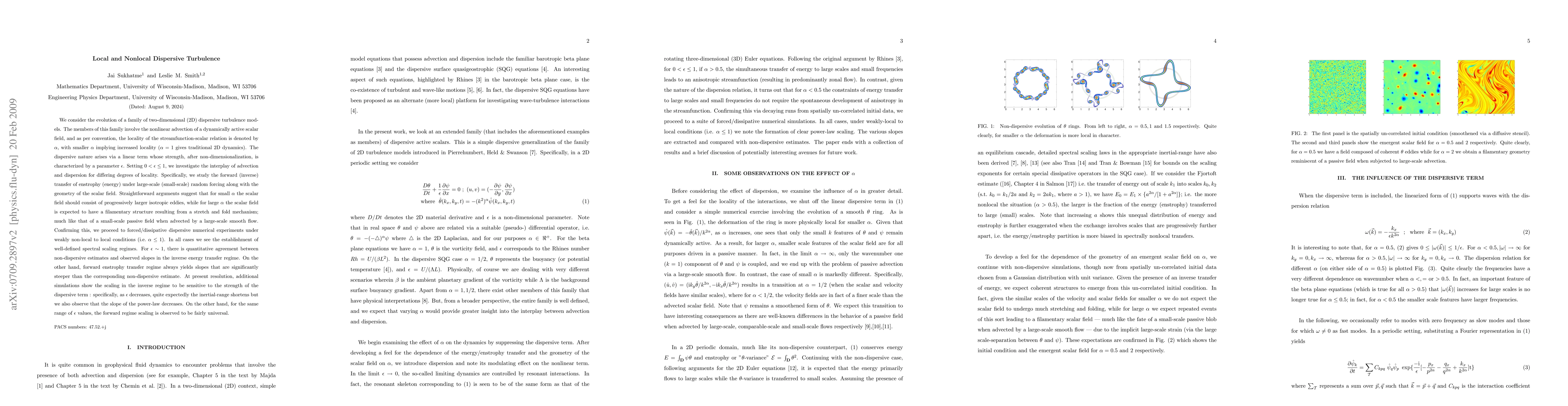 We consider the evolution of a family of 2D dispersive turbulence models. The members of this family involve the nonlinear advection of a dynamically active scalar field, the locality of the streamfunction-scalar relation is denoted by $\alpha$, with smaller $\alpha$ implying increased locality. The dispersive nature arises via a linear term whose strength is characterized by a parameter $\epsilon$. Setting $0 < \epsilon \le 1$, we investigate the interplay of advection and dispersion for differing degrees of locality. Specifically, we study the forward (inverse) transfer of enstrophy (energy) under large-scale (small-scale) random forcing. Straightforward arguments suggest that for small $\alpha$ the scalar field should consist of progressively larger eddies, while for large $\alpha$ the scalar field is expected to have a filamentary structure resulting from a stretch and fold mechanism. Confirming this, we proceed to forced/dissipative dispersive numerical experiments under weakly non-local to local conditions. For $\epsilon \sim 1$, there is quantitative agreement between non-dispersive estimates and observed slopes in the inverse energy transfer regime. On the other hand, forward enstrophy transfer regime always yields slopes that are significantly steeper than the corresponding non-dispersive estimate. Additional simulations show the scaling in the inverse regime to be sensitive to the strength of the dispersive term : specifically, as $\epsilon$ decreases, the inertial-range shortens and we also observe that the slope of the power-law decreases. On the other hand, for the same range of $\epsilon$ values, the forward regime scaling is fairly universal.