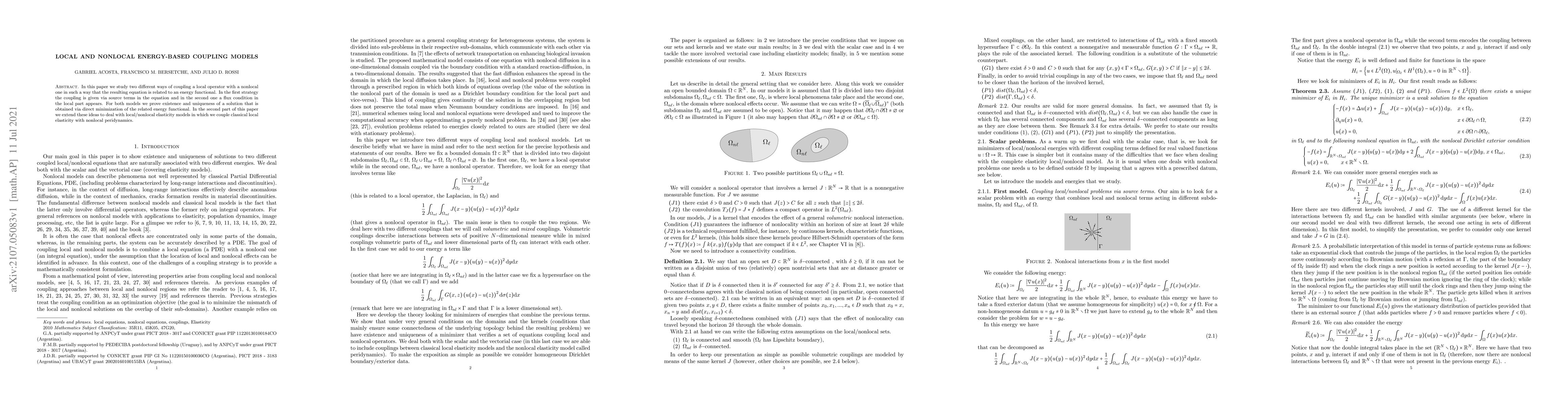 In this paper we study two different ways of coupling a local operator with a nonlocal one in such a way that the resulting equation is related to an energy functional. In the first strategy the coupling is given via source terms in the equation and in the second one a flux condition in the local part appears. For both models we prove existence and uniqueness of a solution that is obtained via direct minimization of the related energy functional. In the second part of this paper we extend these ideas to deal with local/nonlocal elasticity models in which we couple classical local elasticity with nonlocal peridynamics.
