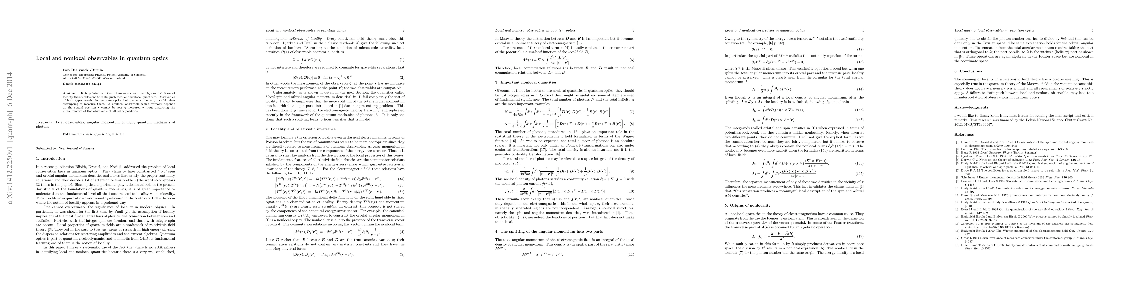 The paper presents a clear distinction between local and nonlocal observables in quantum optics, providing unambiguous criteria for locality and examining the nature of nonlocal quantities such as spin and orbital angular momentum densities.