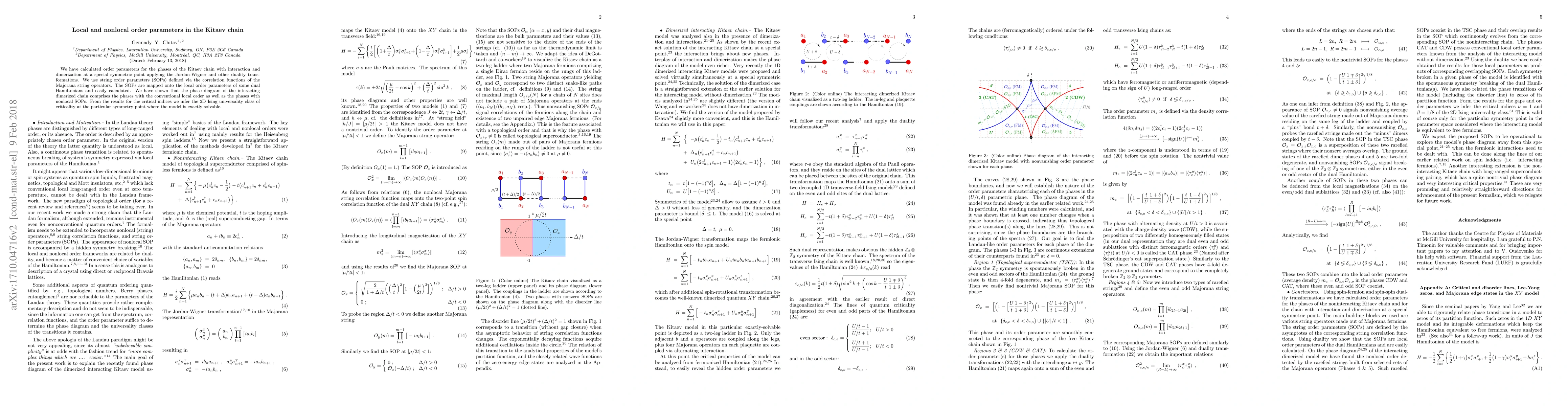 We have calculated order parameters for the phases of the Kitaev chain with interaction and dimerization at a special symmetric point applying the Jordan-Wigner and other duality transformations. We use string order parameters (SOPs) defined via the correlation functions of the Majorana string operators. The SOPs are mapped onto the local order parameters of some dual Hamiltonians and easily calculated. We have shown that the phase diagram of the interacting dimerized chain comprises the phases with the conventional local order as well as the phases with nonlocal SOPs. From the results for the critical indices we infer the 2D Ising universality class of criticality at the particular symmetry point where the model is exactly solvable.
