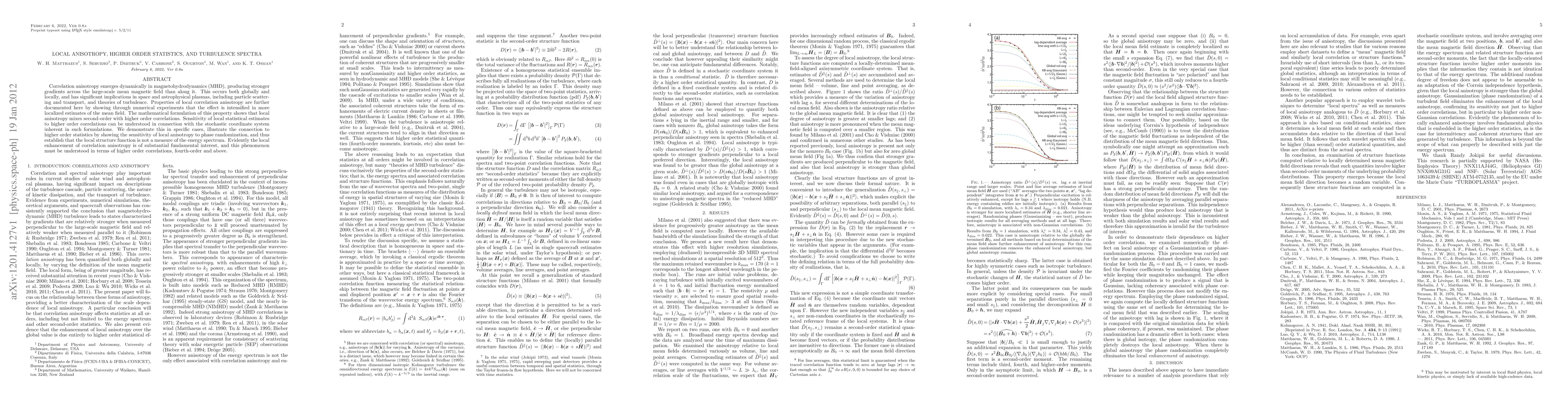 Correlation anisotropy emerges dynamically in magnetohydrodynamics (MHD), producing stronger gradients across the large-scale mean magnetic field than along it. This occurs both globally and locally, and has significant implications in space and astrophysical plasmas, including particle scattering and transport, and theories of turbulence. Properties of local correlation anisotropy are further documented here by showing through numerical experiments that the effect is intensified in more localized estimates of the mean field. The mathematical formulation of this property shows that local anisotropy mixes second-order with higher order correlations. Sensitivity of local statistical estimates to higher order correlations can be understood in connection with the stochastic coordinate system inherent in such formulations. We demonstrate this in specific cases, illustrate the connection to higher order statistics by showing the sensitivity of local anisotropy to phase randomization, and thus establish that the local structure function is not a measure of the energy spectrum. Evidently the local enhancement of correlation anisotropy is of substantial fundamental interest, and this phenomenon must be understood in terms of higher order correlations, fourth-order and above.