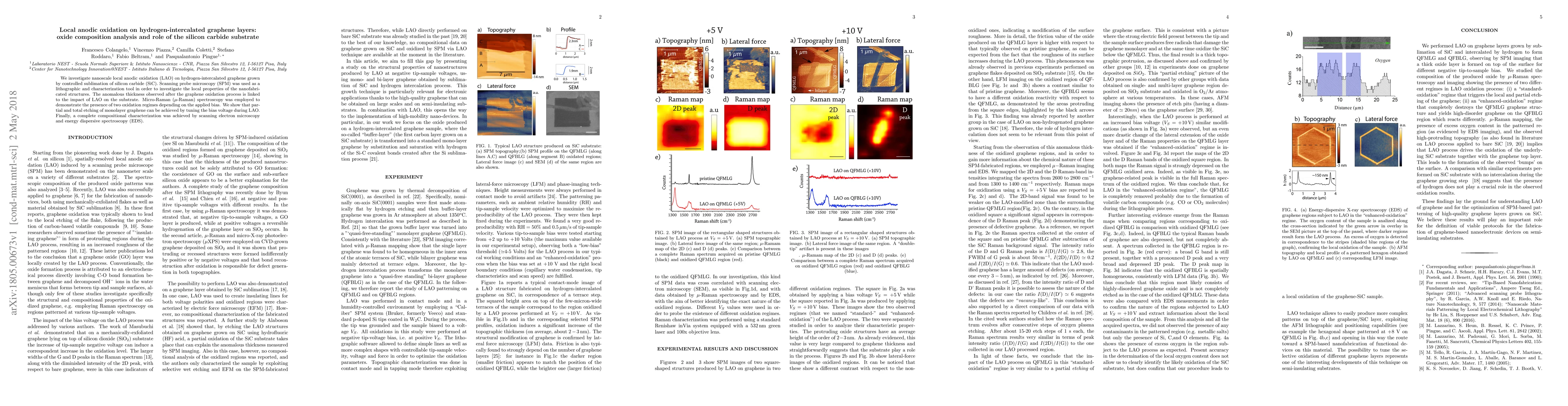 We investigate nanoscale local anodic oxidation (LAO) on hydrogen-intercalated graphene grown by controlled sublimation of silicon carbide (SiC). Scanning probe microscopy (SPM) was used as a lithographic and characterization tool in order to investigate the local properties of the nanofabricated structures. The anomalous thickness observed after the graphene oxidation process is linked to the impact of LAO on the substrate. Micro-Raman spectroscopy was employed to demonstrate the presence of two oxidation regimes depending on the applied bias. We show that partial and total etching of monolayer graphene can be achieved by tuning the bias voltage during LAO. Finally, a complete compositional characterization was achieved by scanning electron microscopy and energy dispersive spectroscopy (EDS).