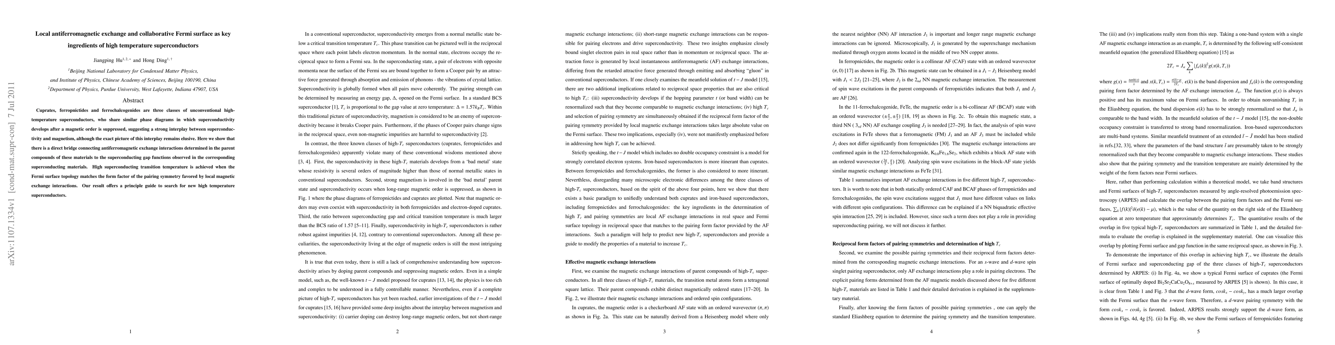 The paper reveals a direct link between local antiferromagnetic exchange interactions in parent compounds of cuprates, ferropnictides, and ferrochalcogenides, and the superconducting gap functions in their superconducting counterparts. High-temperature superconductivity results from a match between Fermi surface topology and the pairing symmetry's form factor, favored by local magnetic exchange interactions, offering a new principle for discovering high-temperature superconductors.