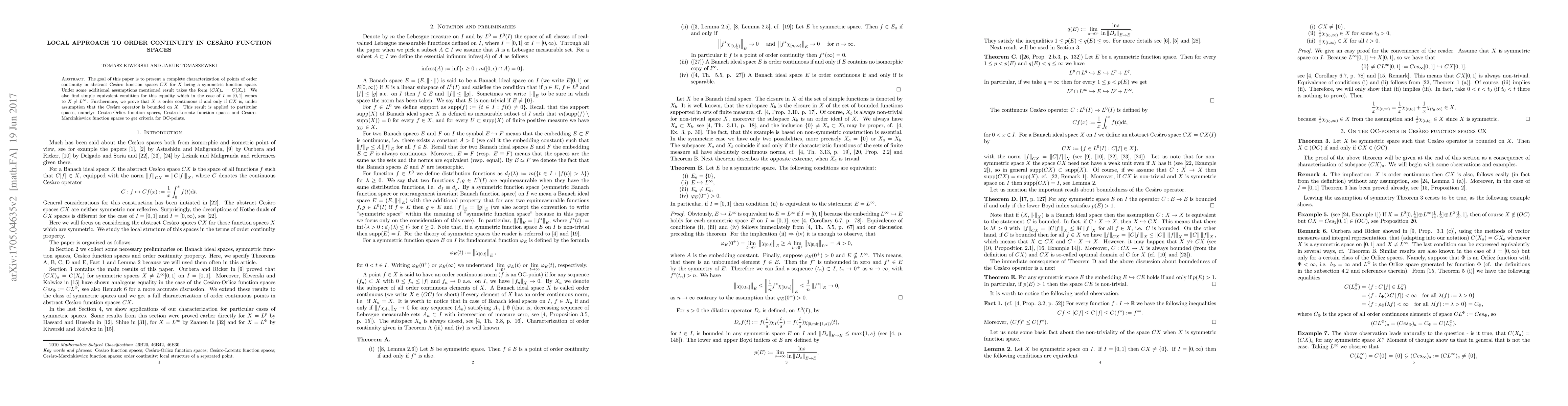 The goal of this paper is to present a complete characterisation of points of order continuity in abstract Ces\`aro function spaces $CX$ for $X$ being a symmetric function space. Under some additional assumptions mentioned result takes the form $(CX)_a = C(X_a)$. We also find simple equivalent condition for this equality which in the case of $I=[0,1]$ comes to $X\neq L^\infty$. Furthermore, we prove that $X$ is order continuous if and only if $CX$ is, under assumption that the Ces\`aro operator is bounded on $X$. This result is applied to particular spaces, namely: Ces\`aro-Orlicz function spaces, Ces\`aro-Lorentz function spaces and Ces\`aro-Marcinkiewicz function spaces to get criteria for OC-points.