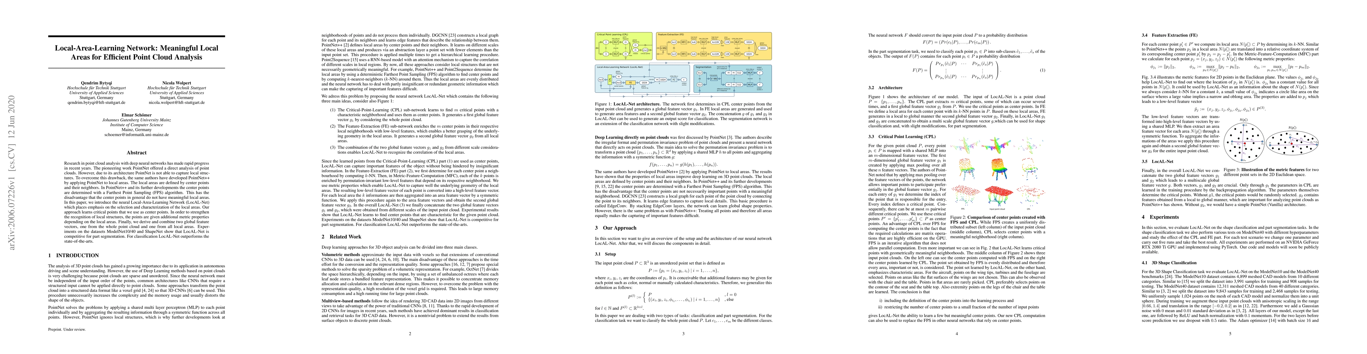 The paper introduces the Local-Area-Learning Network (LocAL-Net) to enhance point cloud analysis by identifying meaningful local areas, improving upon PointNet++'s Farthest Point Sampling. LocAL-Net learns critical points as center points and combines global and local feature vectors, achieving superior classification and competitive part segmentation results.