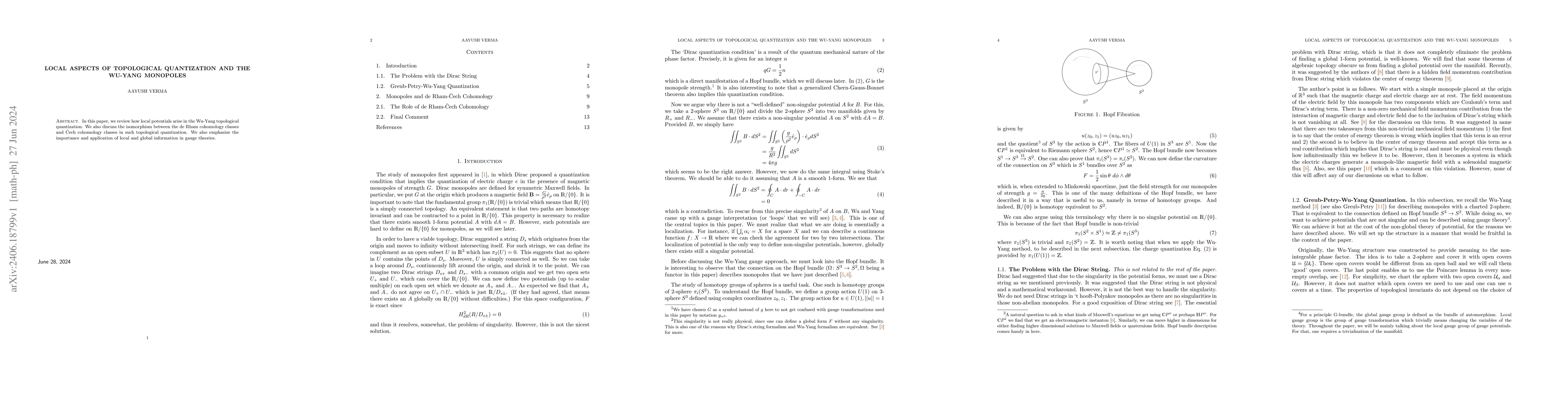 This paper reviews the emergence of local potentials in Wu-Yang topological quantization and explores the isomorphism between de Rham and Cech cohomology classes within this framework, highlighting the significance of both local and global information in gauge theories.