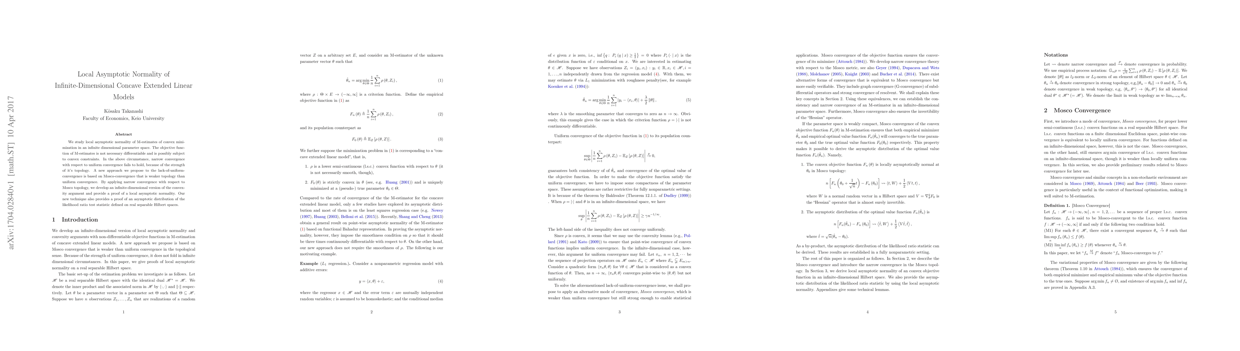 Researchers develop a new approach to study local asymptotic normality of M-estimates in infinite-dimensional parameter spaces with non-differentiable objective functions and convex constraints. They use Mosco-convergence instead of uniform convergence to prove local asymptotic normality and an asymptotic distribution for the likelihood ratio test statistic.