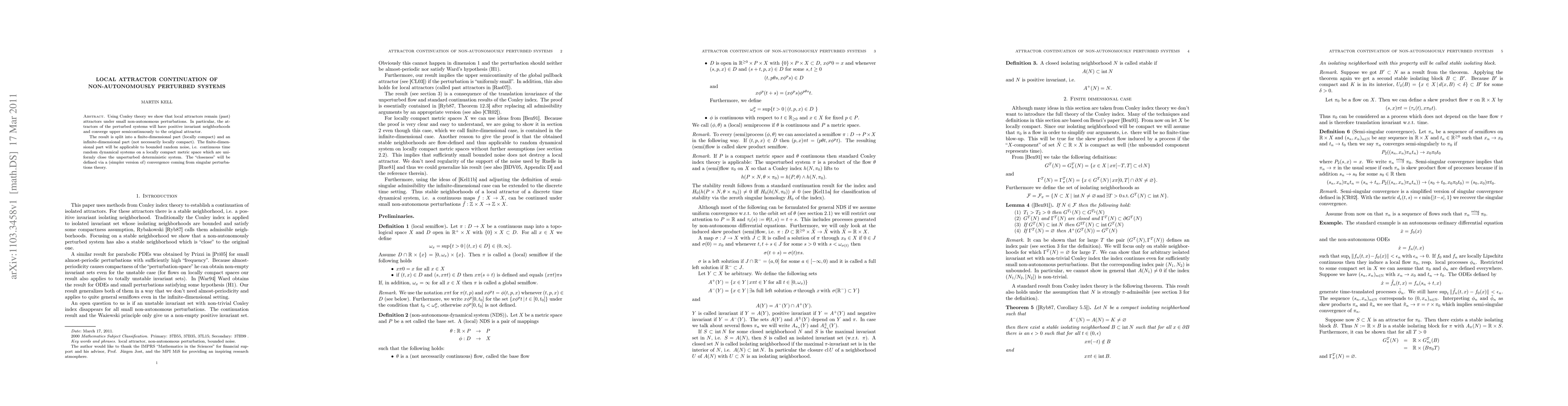 Using Conley theory we show that local attractors remain (past) attractors under small non-autonomous perturbations. In particular, the attractors of the perturbed systems will have positive invariant neighborhoods and converge upper semicontinuously to the original attractor. The result is split into a finite-dimensional part (locally compact) and an infinite-dimensional part (not necessarily locally compact). The finite-dimensional part will be applicable to bounded random noise, i.e. continuous time random dynamical systems on a locally compact metric space which are uniformly close the unperturbed deterministic system. The "closeness" will be defined via a (simpler version of) convergence coming from singular perturbations theory.