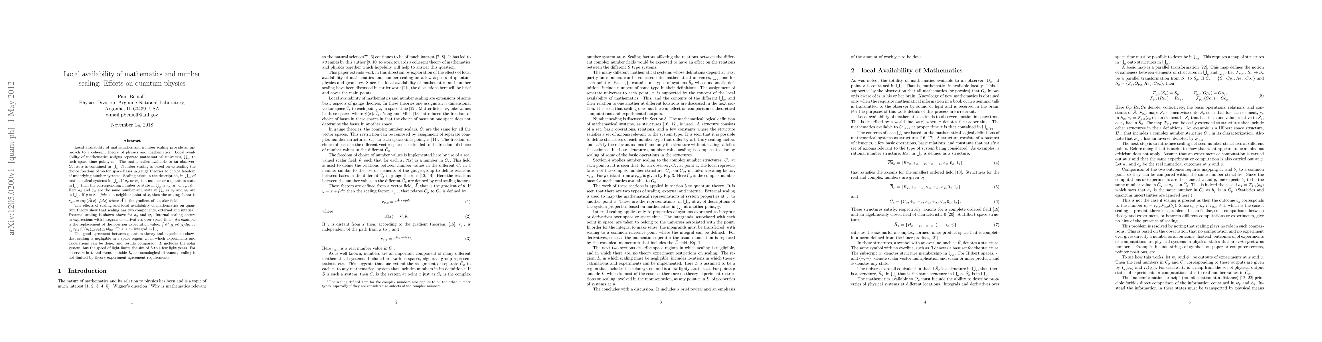 Local availability of mathematics and number scaling provide an approach to a coherent theory of physics and mathematics. Local availability of mathematics assigns separate mathematical universes, U_{x}, to each space time point, x. The mathematics available to an observer, O_{x}, at x is contained in U_{x}. Number scaling is based on extending the choice freedom of vector space bases in gauge theories to choice freedom of underlying number systems. Scaling arises in the description, in U_{x}, of mathematical systems in U_{y}. If a_{y} or \psi_{y} is a number or a quantum state in U_{y}, then the corresponding number or state in U_{x} is r_{y,x}a_{x} or r_{y,x}\psi_{x}. Here a_{x} and \psi_{x} are the same number and state in U_{x} as a_{y} and \psi_{y} are in U_{y}. If y=x+\hat{\mu}dx is a neighbor point of x, then the scaling factor is r_{y,x}=\exp(\vec{A}(x)\cdot\hat{\mu}dx) where \vec{A} is a vector field, assumed here to be the gradient of a scalar field. The effects of scaling and local availability of mathematics on quantum theory show that scaling has two components, external and internal. External scaling is shown above for a_{y} and \psi_{y}. Internal scaling occurs in expressions with integrals or derivatives over space or space time. An example is the replacement of the position expectation value, \int\psi^{*}(y)y\psi(y)dy, by \int_{x}r_{y,x}\psi^{*}_{x}(y_{x})y_{x}\psi_{x}(y_{x})dy_{x}. This is an integral in U_{x}. The good agreement between quantum theory and experiment shows that scaling is negligible in a space region, L, in which experiments and calculations can be done, and results compared. L includes the solar system, but the speed of light limits the size of L to a few light years. Outside of $L$, at cosmological distances, the limits on scaling are not present.