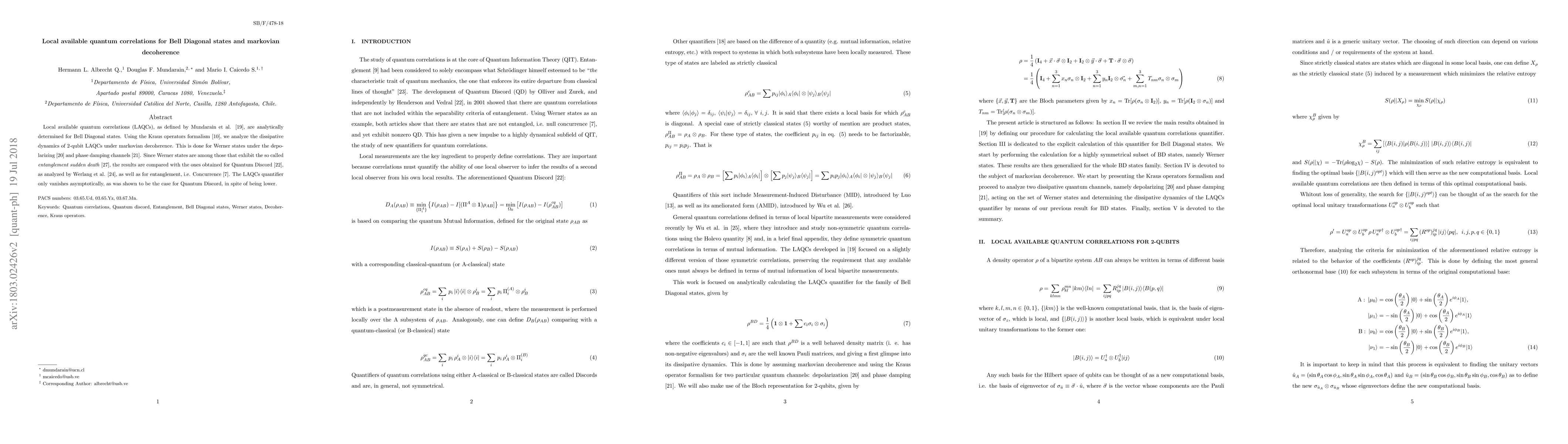 This paper analytically determines local available quantum correlations (LAQCs) for Bell Diagonal states and examines their dynamics under Markovian decoherence through depolarizing and phase damping channels. The study finds that LAQCs, like Quantum Discord, vanish asymptotically, contrasting with entanglement measures like Concurrence.