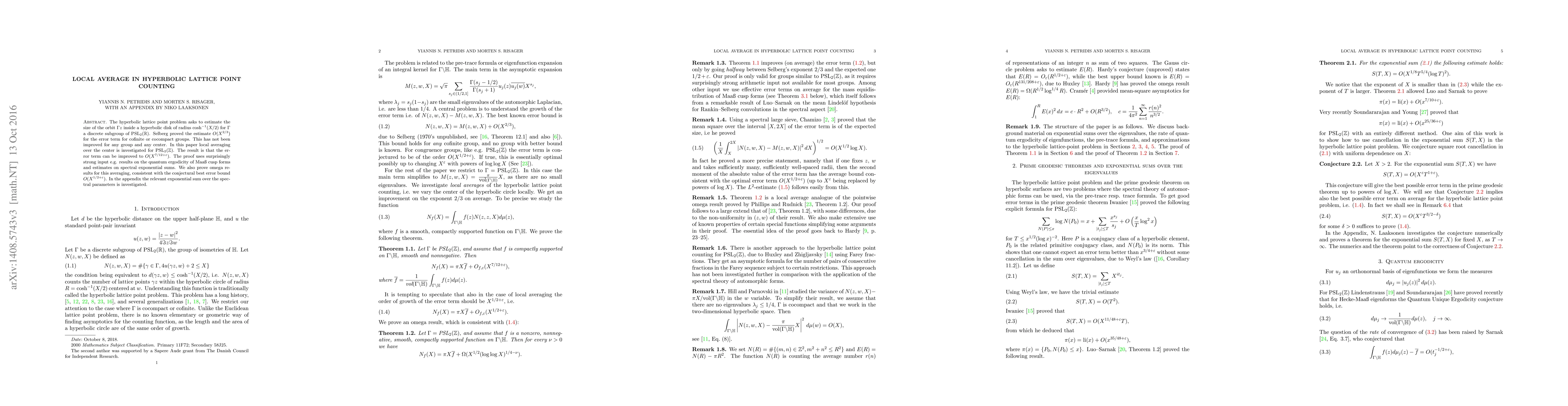 This paper investigates local averaging techniques to improve the error term in hyperbolic lattice point counting for $\hbox{PSL}_2(Z)$, achieving an error term of $O(X^{7/12+\epsilon})$, surpassing previous results. The proof leverages advanced tools including quantum ergodicity and spectral exponential sums.