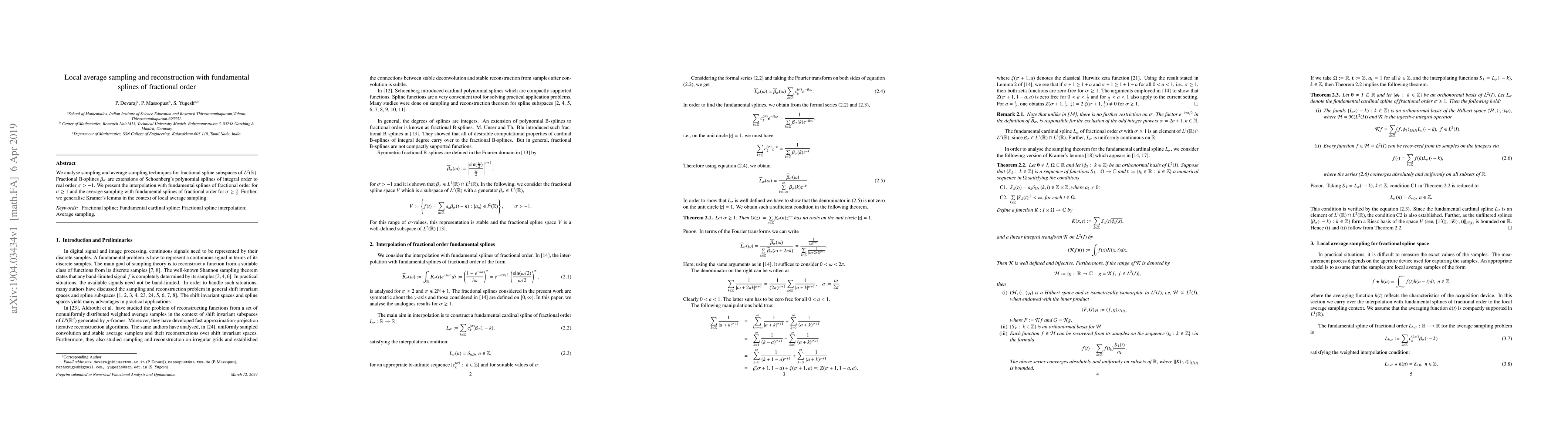 We analyse sampling and average sampling techniques for fractional spline subspaces of $L^{2}({\mathbb{R}}).$ Fractional B-splines $\beta_{\sigma}$ are extensions of Schoenberg's polynomial splines of integral order to real order $\sigma > -1$. We present the interpolation with fundamental splines of fractional order for $\sigma \geq 1$ and the average sampling with fundamental splines of fractional order for $\sigma \geq \frac{3}{2}.$ Further, we generalise Kramer's lemma in the context of local average sampling.