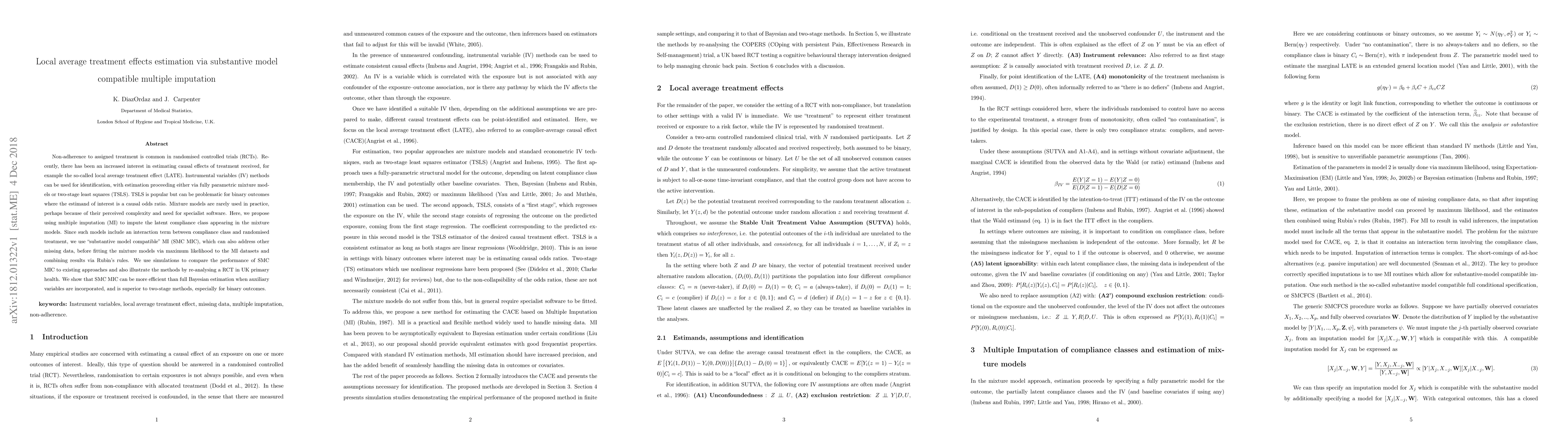 This paper proposes using substantive model compatible multiple imputation (SMC MI) to estimate local average treatment effects in randomized controlled trials with non-adherence. The method is shown to be more efficient than two-stage least squares and full Bayesian estimation, especially for binary outcomes.