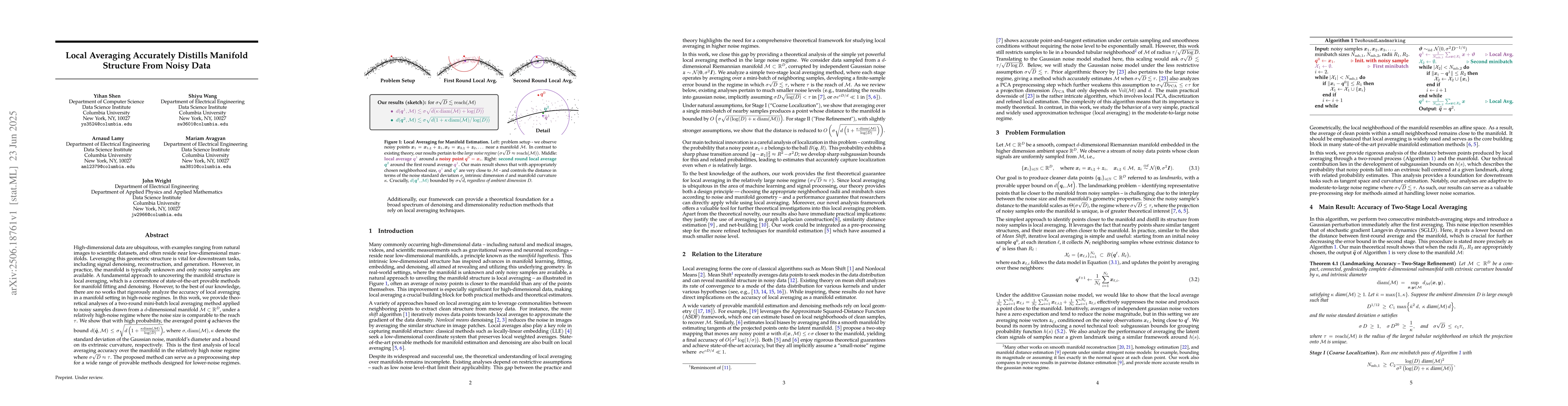 High-dimensional data are ubiquitous, with examples ranging from natural images to scientific datasets, and often reside near low-dimensional manifolds. Leveraging this geometric structure is vital for downstream tasks, including signal denoising, reconstruction, and generation. However, in practice, the manifold is typically unknown and only noisy samples are available. A fundamental approach to uncovering the manifold structure is local averaging, which is a cornerstone of state-of-the-art provable methods for manifold fitting and denoising. However, to the best of our knowledge, there are no works that rigorously analyze the accuracy of local averaging in a manifold setting in high-noise regimes. In this work, we provide theoretical analyses of a two-round mini-batch local averaging method applied to noisy samples drawn from a $d$-dimensional manifold $\mathcal M \subset \mathbb{R}^D$, under a relatively high-noise regime where the noise size is comparable to the reach $\tau$. We show that with high probability, the averaged point $\hat{\mathbf q}$ achieves the bound $d(\hat{\mathbf q}, \mathcal M) \leq \sigma \sqrt{d\left(1+\frac{\kappa\mathrm{diam}(\mathcal {M})}{\log(D)}\right)}$, where $\sigma, \mathrm{diam(\mathcal M)},\kappa$ denote the standard deviation of the Gaussian noise, manifold's diameter and a bound on its extrinsic curvature, respectively. This is the first analysis of local averaging accuracy over the manifold in the relatively high noise regime where $\sigma \sqrt{D} \approx \tau$. The proposed method can serve as a preprocessing step for a wide range of provable methods designed for lower-noise regimes. Additionally, our framework can provide a theoretical foundation for a broad spectrum of denoising and dimensionality reduction methods that rely on local averaging techniques.