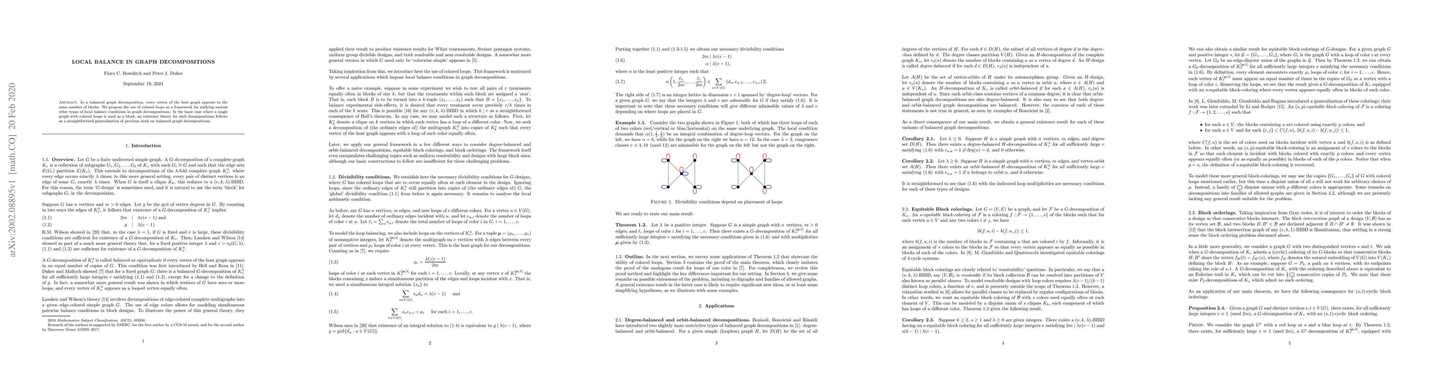 In a balanced graph decomposition, every vertex of the host graph appears in the same number of blocks. We propose the use of colored loops as a framework for unifying various other types of local balance conditions in graph decompositions. In the basic case where a single graph with colored loops is used as a block, an existence theory for such decompositions follows as a straightforward generalization of previous work on balanced graph decompositions.