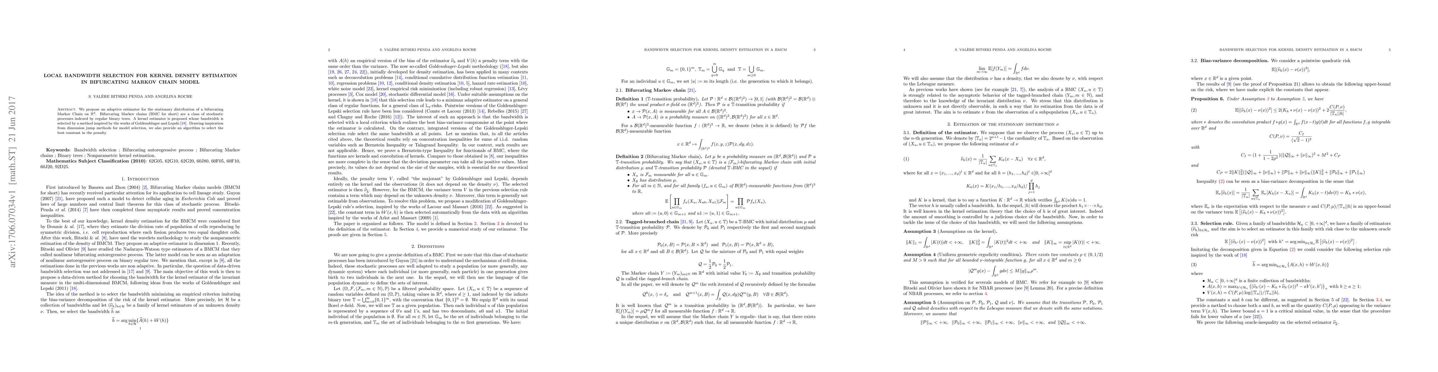 This paper proposes an adaptive kernel density estimator for the stationary distribution of bifurcating Markov chains, with a local bandwidth selection method inspired by Goldenshluger and Lepski's work. It also includes an algorithm for selecting the optimal penalty constant, leveraging dimension jump methods for model selection.
