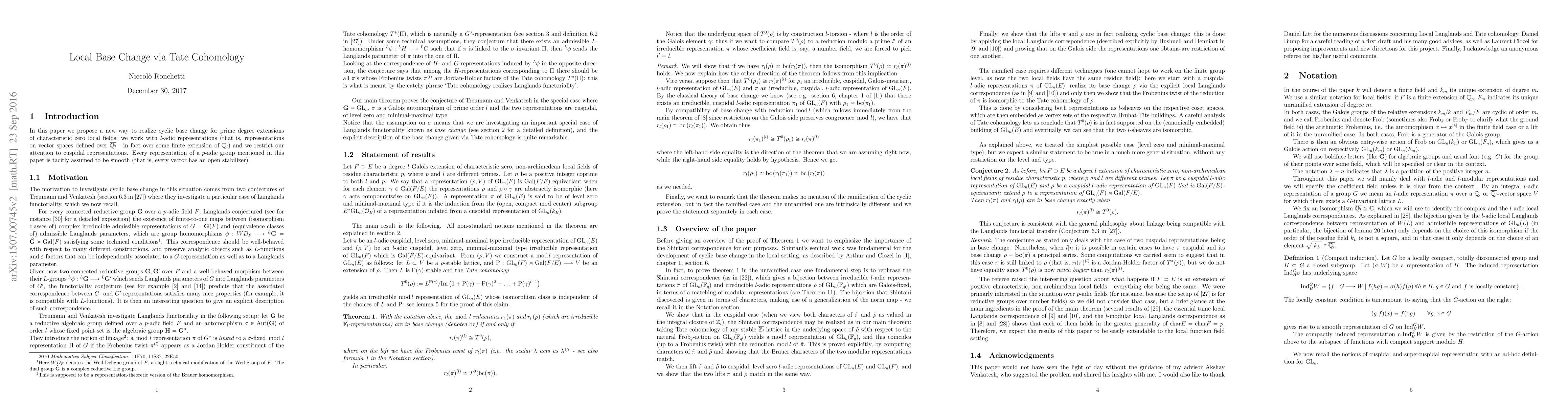 This paper establishes a new method for cyclic base change in prime degree extensions of characteristic zero local fields, showing that the $\bmod l$-reductions of certain $l$-adic representations are in base change if Tate cohomology of one representation matches the Frobenius twist of the other under specified technical conditions. This proves a conjecture related to linkage and Langlands functoriality.
