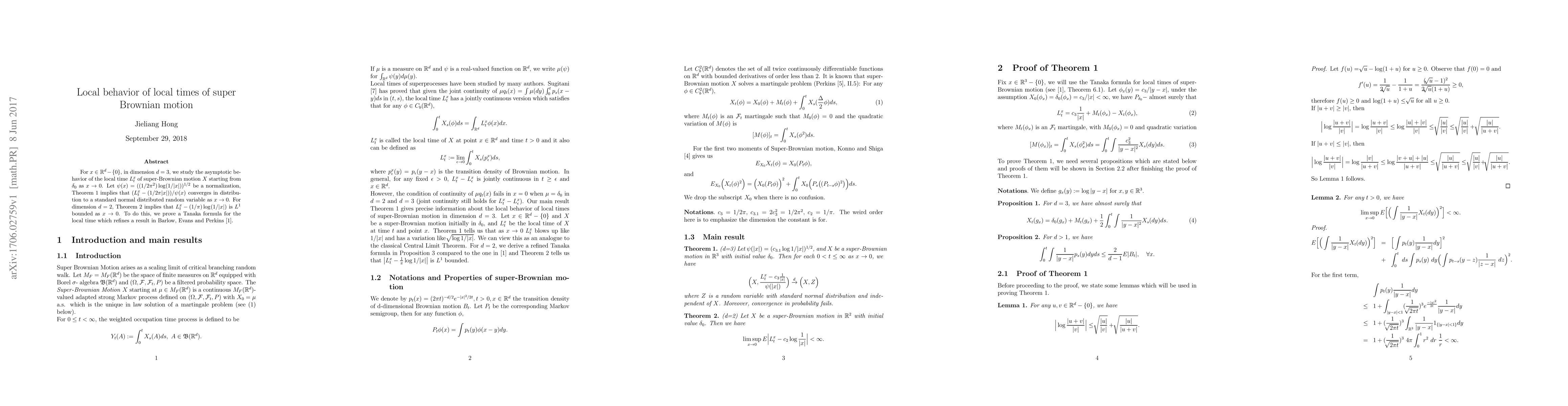 For $x\in R^d- \{0\}$, in dimension $d=3$, we study the asymptotic behavior of the local time $L_t^x$ of super-Brownian motion $X$ starting from $\delta_0$ as $x \to 0$. Let $\psi(x)=((1/2\pi^2) \log (1/|x|))^{1/2}$ be a normalization, Theorem 1 implies that $(L_t^x-(1/2\pi|x|))/\psi(x)$ converges in distribution to a standard normal distributed random variable as $x\to 0$. For dimension $d=2$, Theorem 2 implies that $L^x_t-(1/\pi)\log(1/|x|)$ is $L^1$ bounded as $x\to 0$. To do this, we prove a Tanaka formula for the local time which refines a result in Barlow, Evans and Perkins.