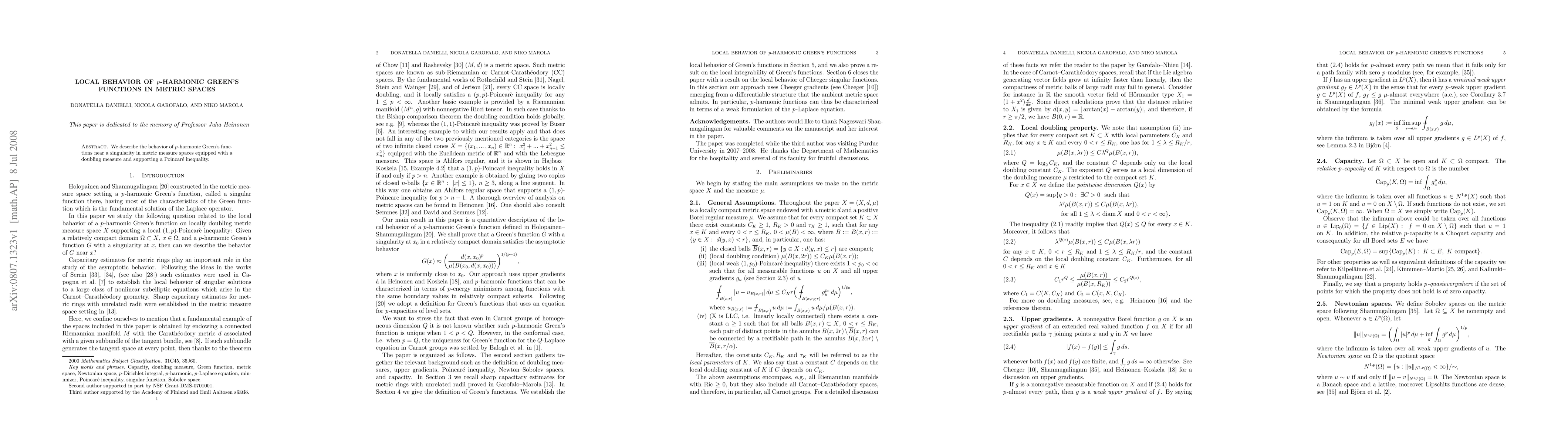 Summary: This paper investigates the local behavior of p-harmonic Green's functions near singularities in metric measure spaces, focusing on the conditions under which these functions exhibit specific properties. The study is grounded in spaces that satisfy a doubling measure and Poincaré inequality.