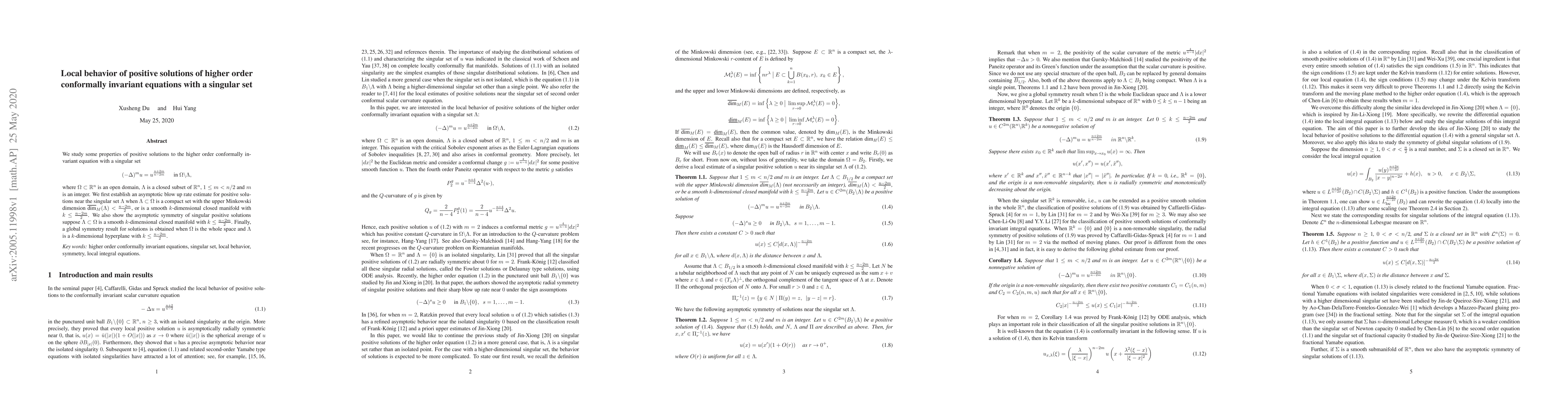 We study some properties of positive solutions to the higher order conformally invariant equation with a singular set $$ (-\Delta)^m u = u^{\frac{n+2m}{n-2m}} ~~~~~~ \textmd{in} ~ \Omega \backslash \Lambda, $$ where $\Omega \subset \mathbb{R}^n$ is an open domain, $\Lambda$ is a closed subset of $\mathbb{R}^n$, $1 \leq m < n/2$ and $m$ is an integer. We first establish an asymptotic blow up rate estimate for positive solutions near the singular set $\Lambda$ when $\Lambda \subset \Omega$ is a compact set with the upper Minkowski dimension $\overline{\textmd{dim}}_M(\Lambda) < \frac{n-2m}{2}$, or is a smooth $k$-dimensional closed manifold with $k\leq \frac{n-2m}{2}$. We also show the asymptotic symmetry of singular positive solutions suppose $\Lambda \subset \Omega$ is a smooth $k$-dimensional closed manifold with $k\leq \frac{n-2m}{2}$. Finally, a global symmetry result for solutions is obtained when $\Omega$ is the whole space and $\Lambda$ is a $k$-dimensional hyperplane with $k\leq \frac{n-2m}{2}$.