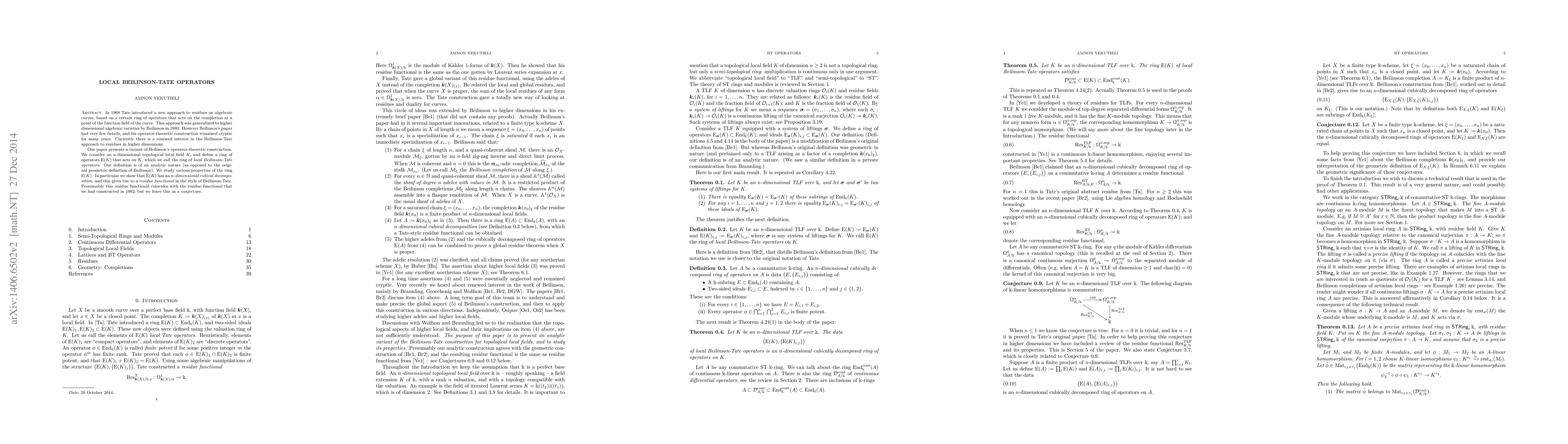 In 1968 Tate introduced a new approach to residues on algebraic curves, based on a certain ring of operators that acts on the completion at a point of the function field of the curve. This approach was generalized to higher dimensional algebraic varieties by Beilinson in 1980. However Beilinson's paper had very few details, and his operator-theoretic construction remained cryptic for many years. Currently there is a renewed interest in the Beilinson-Tate approach to residues in higher dimensions. Our paper presents a variant of Beilinson's operator-theoretic construction. We consider an n-dimensional topological local field K, and define a ring of operators E(K) that acts on K, which we call the ring of local Beilinson-Tate operators. Our definition is of an analytic nature (as opposed to the original geometric definition of Beilinson). We study various properties of the ring E(K). In particular we show that E(K) has an n-dimensional cubical decomposition, and this gives rise to a residue functional in the style of Beilinson-Tate. Presumably this residue functional coincides with the residue functional that we had constructed in 1992; but we leave this as a conjecture.