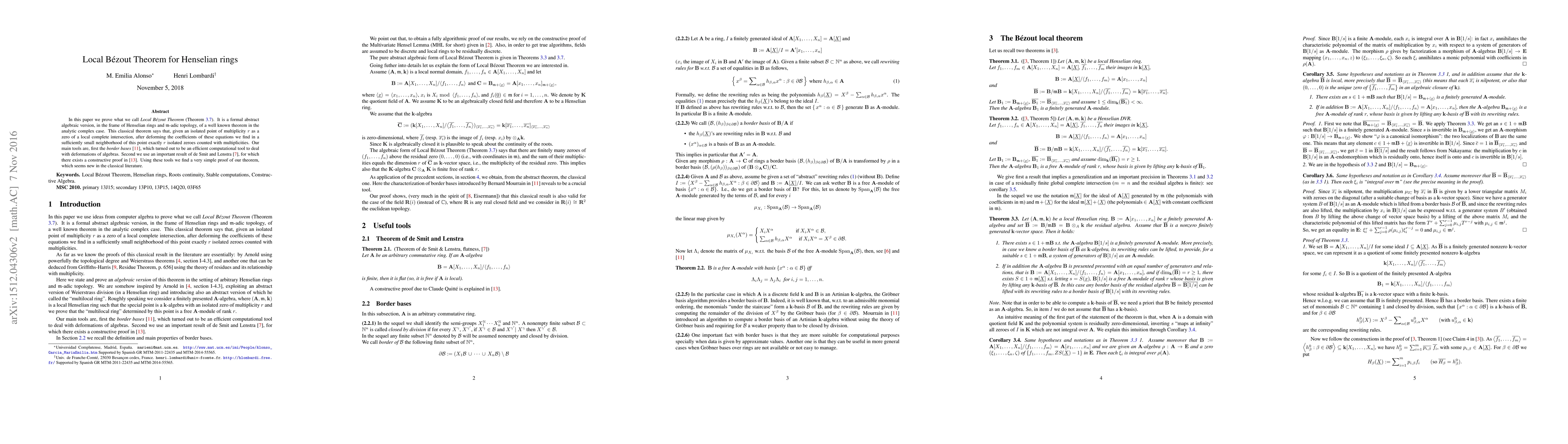 This paper gives an elementary proof of an improved version of the algebraic Local B\'ezout Theorem (given by the authors in JSC 45 (2010) 975--985). Here we remove some ad hoc hypotheses and obtain an optimal algebraic version of the theorem. Given a system of $n$ polynomials in $n$ indeterminates with coefficients in a local normal domain $(A, m,k)$ with an algebraically closed quotient field, which residually defines an isolated point in $k^n$ of multiplicity $r$, we prove that there are finitely many zeroes of the system above the residual zero (i.e., with coordinates in $m$), and the sum of their multiplicities is $r$. Our proof is based on the border basis technique of computational algebra. Here we state and prove an {\em algebraic version} of this theorem in the setting of arbitrary Henselian rings and $m$-adic topology. We are somehow inspired by Arnold, exploiting an abstract version of Weierstrass division (in a Henselian ring) and we introduce also an abstract version of which he called the "multilocal ring". Roughly speaking we consider a finitely presented $A$-algebra, where $(A, m, k)$ is a local ring such that the special point is a $k$-algebra with an isolated zero of multiplicity $r$ and we prove that the "multilocal ring" determined by this point is a free $A$-module of rank $r$.