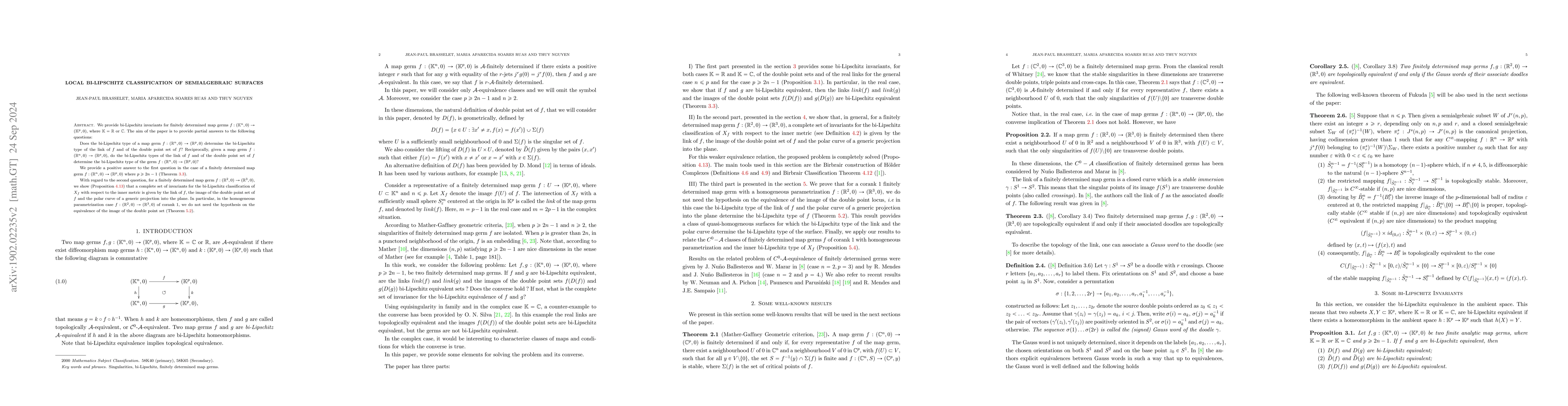 We provide bi-Lipschitz invariants for finitely determined map germs $f: (\mathbb{K}^n,0) \to (\mathbb{K}^p, 0)$, where $\mathbb{K} = \mathbb{R}$ or $ \mathbb{C}$. The aim of the paper is to provide partial answers to the following questions: Does the bi-Lipschitz type of a map germ $f: (\mathbb{R}^n, 0) \to (\mathbb{R}^p, 0)$ determine the bi-Lipschitz type of the link of $f$ and of the double point set of $f$? Reciprocally, given a map germ $f: (\mathbb{R}^n, 0) \to (\mathbb{R}^p, 0)$, do the bi-Lipschitz types of the link of $f$ and of the double point set of $f$ determine the bi-Lipschitz type of the germ $f: (\mathbb{R}^n, 0) \to (\mathbb{R}^p, 0)$? We provide a positive answer to the first question in the case of a finitely determined map germ $f: (\mathbb{R}^n, 0) \to (\mathbb{R}^p, 0)$ where $2n-1 \leq p$. With regard to the second question, for a finitely determined map germ $f : (\mathbb{R}^2,0) \to (\mathbb{R}^3,0),$ we show that the bi-Lipschitz type of the link of $f$ and of the double point set of $f$ determine the bi-Lipschitz type of the image $X_f=f(U),$ where $U$ is a small neighbourhood of the origin in $\mathbb R^2.$ In the case of a finitely determined map germ $f: (\mathbb{R}^2, 0) \to (\mathbb{R}^3, 0)$ of corank 1 with homogeneous parametrization, the bi-Lipschitz type of the link of $f$ determines the bi-Lipschitz type of the map germ. Finally, we discuss the bi-Lipschitz equivalence of homogeneous surfaces in $\mathbb{R}^3$.