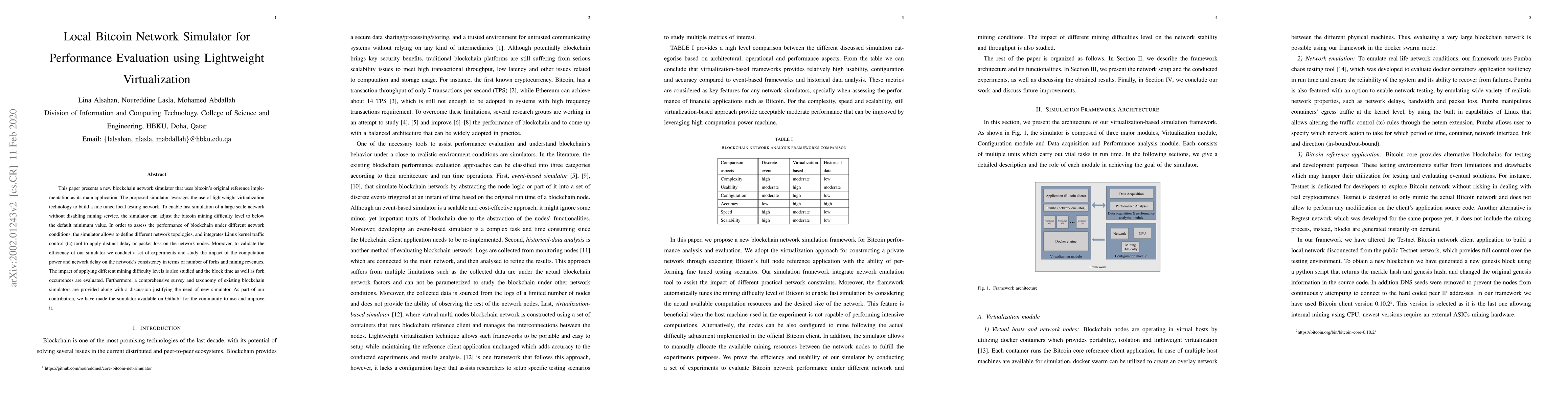 The paper presents a new blockchain network simulator using Bitcoin's original reference implementation and lightweight virtualization technology. It allows for fast simulation of large-scale networks by adjusting mining difficulty below the default minimum value. The simulator can define different network topologies and apply distinct delays or packet loss using Linux kernel traffic control (tc) tool.