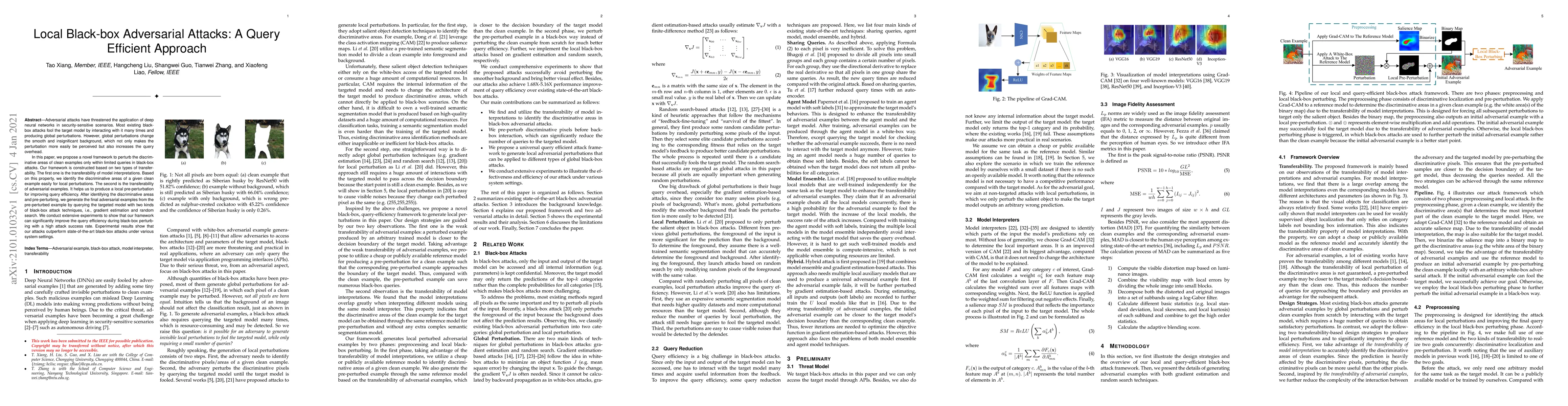 This paper proposes a novel framework for local black-box adversarial attacks that focuses on perturbing discriminative areas of clean examples with minimal queries. It leverages model interpretation and adversarial example transferability to enhance query efficiency while maintaining high attack success rates.