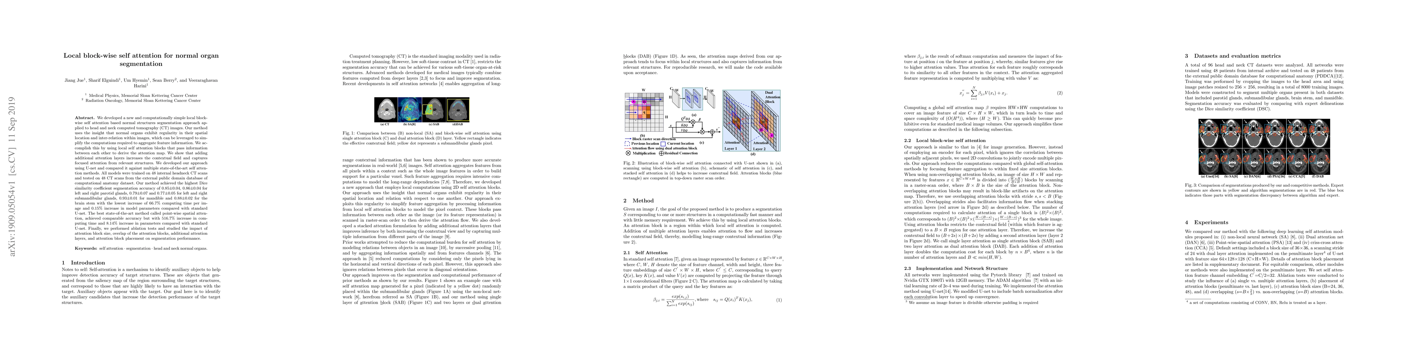 This paper proposes a local block-wise self-attention method for segmenting normal organs in head and neck CT scans, achieving high accuracy with minimal computational overhead compared to state-of-the-art methods. The approach uses local self-attention blocks within a U-net framework, resulting in superior Dice similarity coefficients and significantly lower computing time and parameter increases.