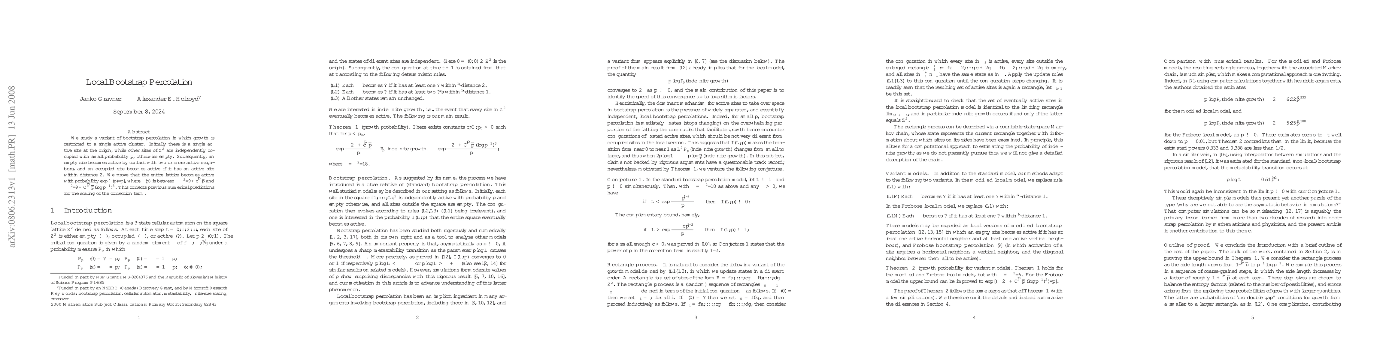 This paper investigates a localized variant of bootstrap percolation on a Z^2 lattice, where growth is confined to a single active cluster. The authors prove that the entire lattice becomes active with probability exp[alpha(p)/p], correcting previous numerical predictions for the scaling of the correction term.