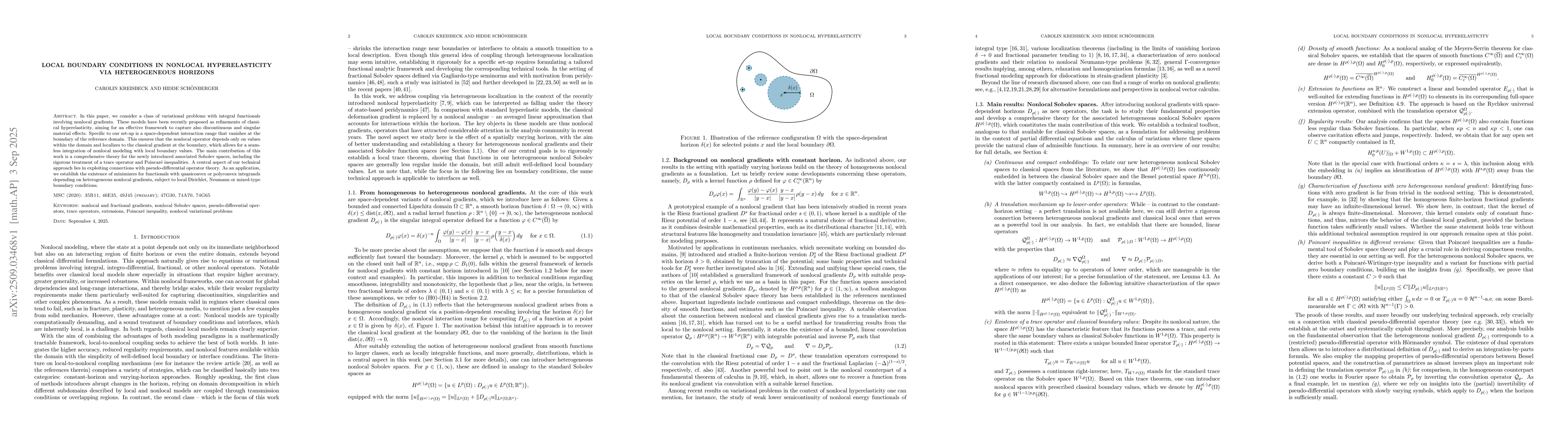 In this paper, we consider a class of variational problems with integral functionals involving nonlocal gradients. These models have been recently proposed as refinements of classical hyperelasticity, aiming for an effective framework to capture also discontinuous and singular material effects. Specific to our set-up is a space-dependent interaction range that vanishes at the boundary of the reference domain. This ensures that the nonlocal operator depends only on values within the domain and localizes to the classical gradient at the boundary, which allows for a seamless integration of nonlocal modeling with local boundary values. The main contribution of this work is a comprehensive theory for the newly introduced associated Sobolev spaces, including the rigorous treatment of a trace operator and Poincar\'e inequalities. A central aspect of our technical approach lies in exploiting connections with pseudo-differential operator theory. As an application, we establish the existence of minimizers for functionals with quasiconvex or polyconvex integrands depending on heterogeneous nonlocal gradients, subject to local Dirichlet, Neumann or mixed-type boundary conditions.