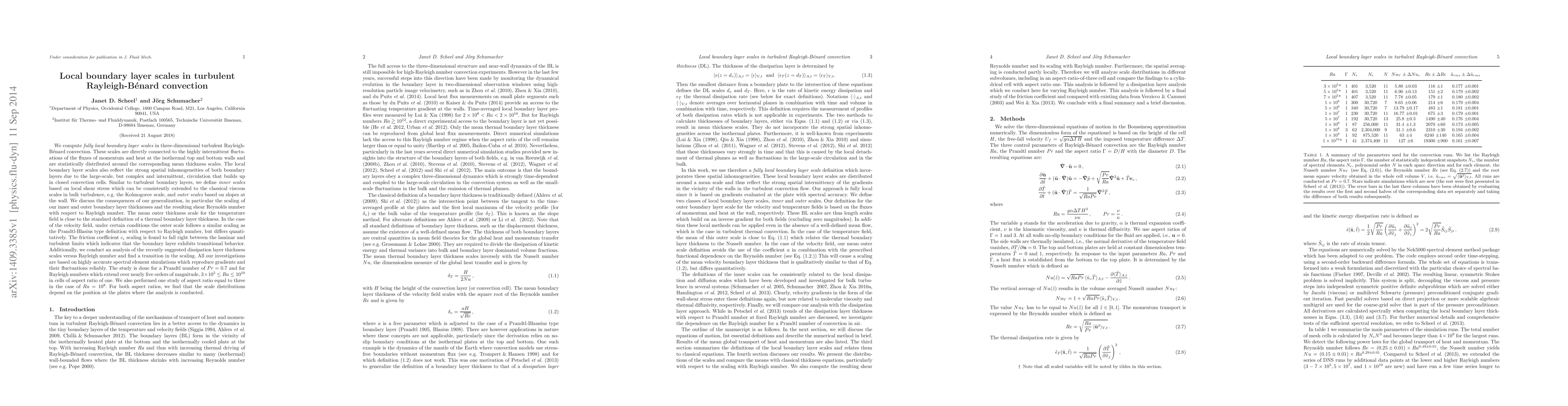 We compute fully local boundary layer scales in three-dimensional turbulent Rayleigh-Benard convection. These scales are directly connected to the highly intermittent fluctuations of the fluxes of momentum and heat at the isothermal top and bottom walls and are statistically distributed around the corresponding mean thickness scales. The local boundary layer scales also reflect the strong spatial inhomogeneities of both boundary layers due to the large-scale, but complex and intermittent, circulation that builds up in closed convection cells. Similar to turbulent boundary layers, we define inner scales based on local shear stress which can be consistently extended to the classical viscous scales in bulk turbulence, e.g. the Kolmogorov scale, and outer scales based on slopes at the wall. We discuss the consequences of our generalization, in particular the scaling of our inner and outer boundary layer thicknesses and the resulting shear Reynolds number with respect to Rayleigh number. The mean outer thickness scale for the temperature field is close to the standard definition of a thermal boundary layer thickness. In the case of the velocity field, under certain conditions the outer scale follows a similar scaling as the Prandtl-Blasius type definition with respect to Rayleigh number, but differs quantitatively. The friction coefficient c_epsilon scaling is found to fall right between the laminar and turbulent limits which indicates that the boundary layer exhibits transitional behavior. Additionally, we conduct an analysis of the recently suggested dissipation layer thickness scales versus Rayleigh number and find a transition in the scaling. We also performed one study of aspect ratio equal to three in the case of Ra=1e+8.