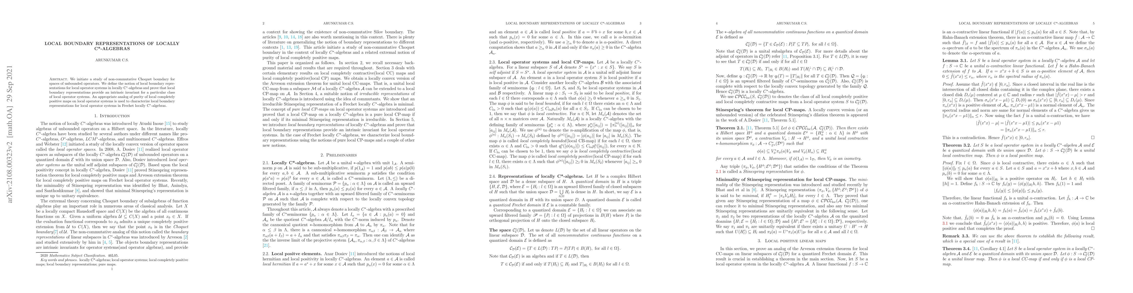 This paper introduces the concept of local boundary representations for locally C*-algebras, establishing them as intrinsic invariants for specific local operator systems. The study leverages an analog of purity for local completely positive maps to characterize these representations in Frechet locally C*-algebras.