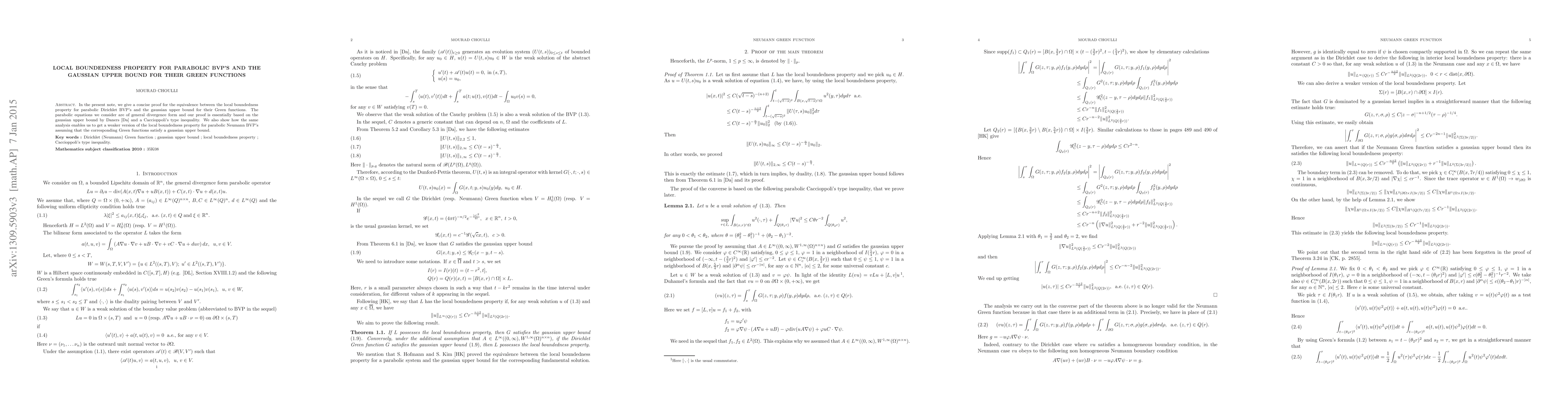 In the present note, we give a concise proof for the equivalence between the local boundedness property for parabolic Dirichlet BVP's and the gaussian upper bound for their Green functions. The parabolic equations we consider are of general divergence form and our proof is essentially based on the gaussian upper bound by Daners \cite{Da} and a Caccioppoli's type inequality. We also show how the same analysis enables us to get a weaker version of the local boundedness property for parabolic Neumann BVP's assuming that the corresponding Green functions satisfy a gaussian upper bound.