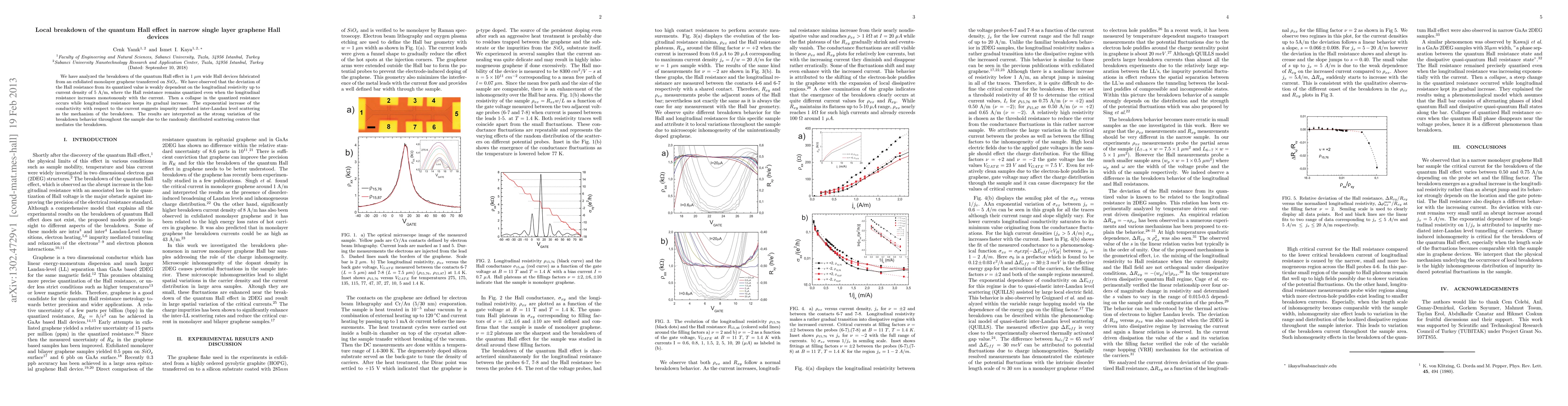 We have analyzed the breakdown of the quantum Hall effect in 1 micrometer wide Hall devices fabricated from an exfoliated monolayer graphene transferred on SiOx. We have observed that the deviation of the Hall resistance from its quantized value is weakly dependent on the longitudinal resistivity up to current density of 5 A/m, where the Hall resistance remains quantized even when the longitudinal resistance increases monotonously with the current. Then a collapse in the quantized resistance occurs while longitudinal resistance keeps its gradual increase. The exponential increase of the conductivity with respect to the current suggests impurity mediated inter-Landau level scattering as the mechanism of the breakdown. The results are interpreted as the strong variation of the breakdown behavior throughout the sample due to the randomly distributed scattering centers that mediates the breakdown.