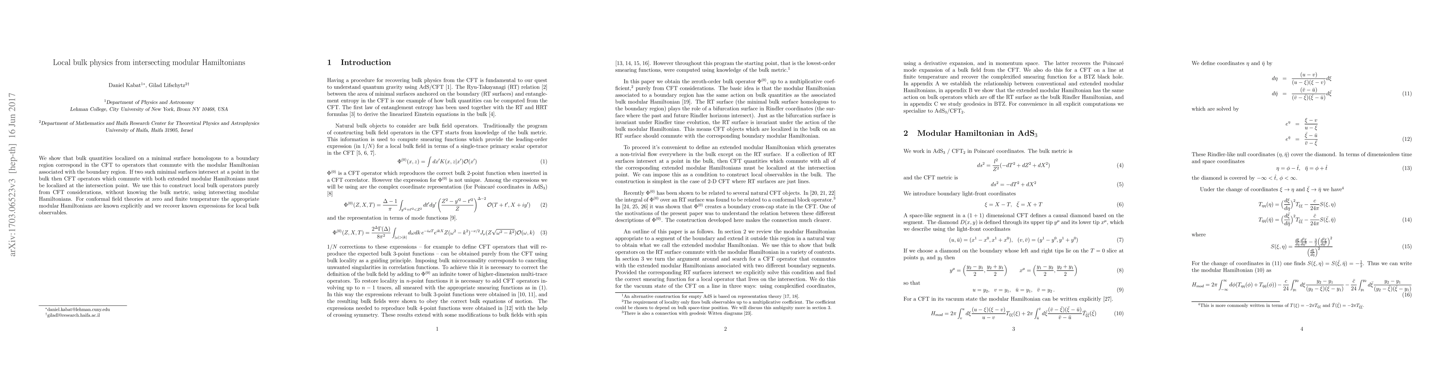This paper demonstrates that bulk quantities on minimal surfaces correspond to CFT operators commuting with modular Hamiltonians of boundary regions. It constructs local bulk operators from CFT using intersecting modular Hamiltonians, recovering known expressions for local bulk observables in both zero and finite temperature conformal field theories.