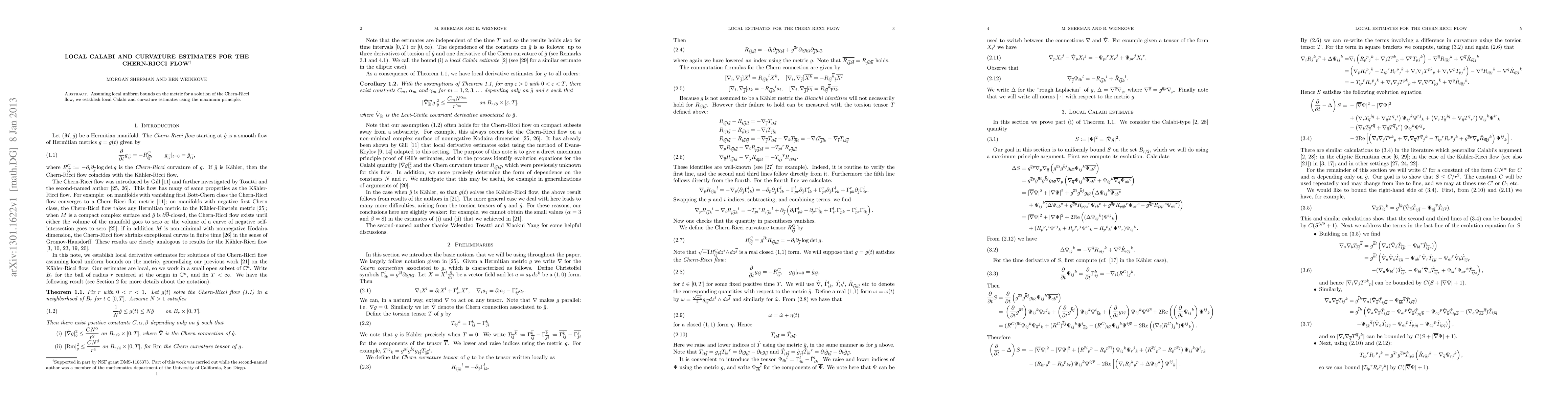 Summary: This paper establishes local Calabi and curvature estimates for the Chern-Ricci flow under the assumption of local uniform bounds on the metric, utilizing the maximum principle to achieve these results.