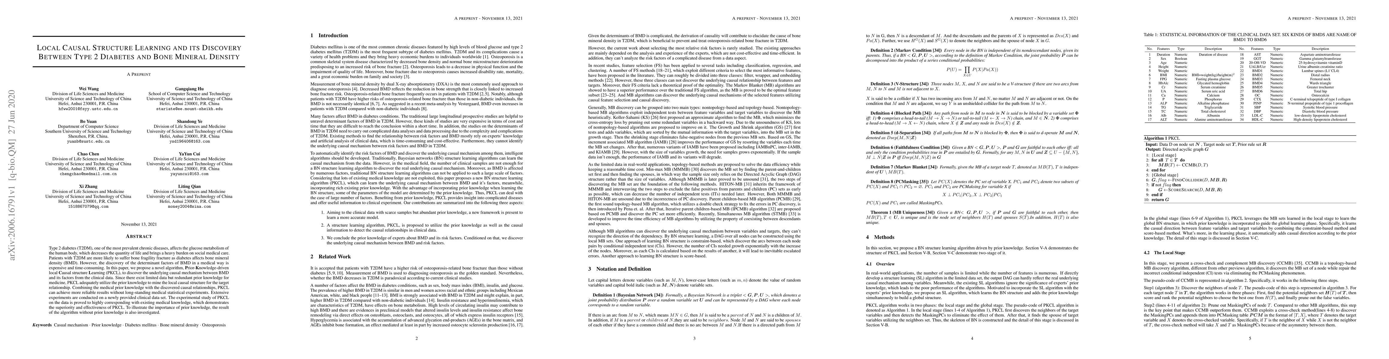 This paper proposes a novel algorithm, Prior-Knowledge-driven local Causal structure Learning (PKCL), to uncover the causal relationship between Type 2 diabetes and bone mineral density using clinical data. The algorithm leverages medical prior knowledge to efficiently discover causal mechanisms, demonstrating effectiveness and reliability without extensive medical experiments.