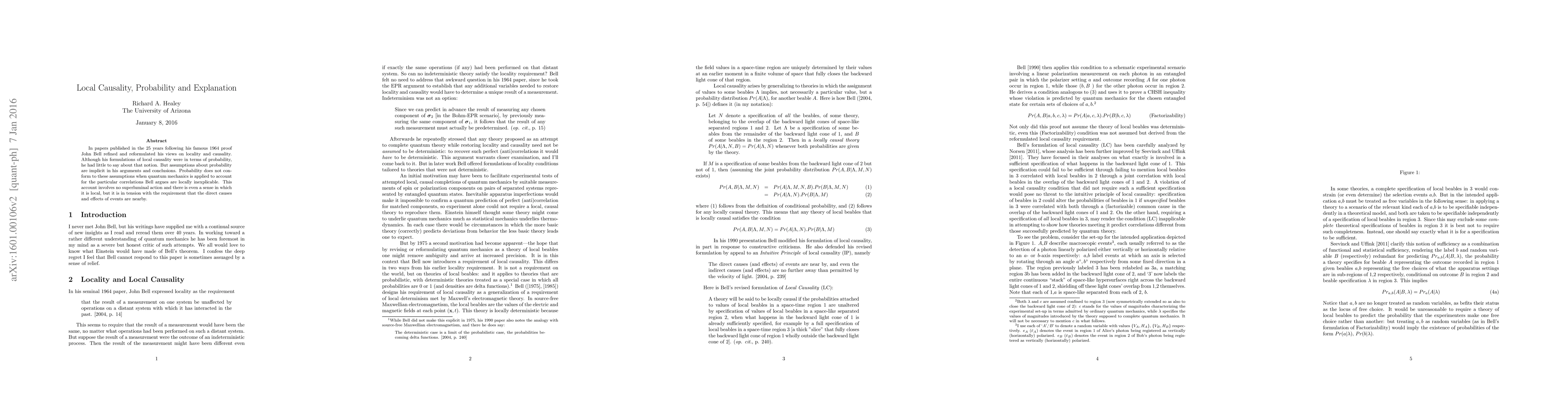 In papers published in the 25 years following his famous 1964 proof John Bell refined and reformulated his views on locality and causality. Although his formulations of local causality were in terms of probability, he had little to say about that notion. But assumptions about probability are implicit in his arguments and conclusions. Probability does not conform to these assumptions when quantum mechanics is applied to account for the particular correlations Bell argues are locally inexplicable. This account involves no superluminal action and there is even a sense in which it is local, but it is in tension with the requirement that the direct causes and effects of events are nearby.