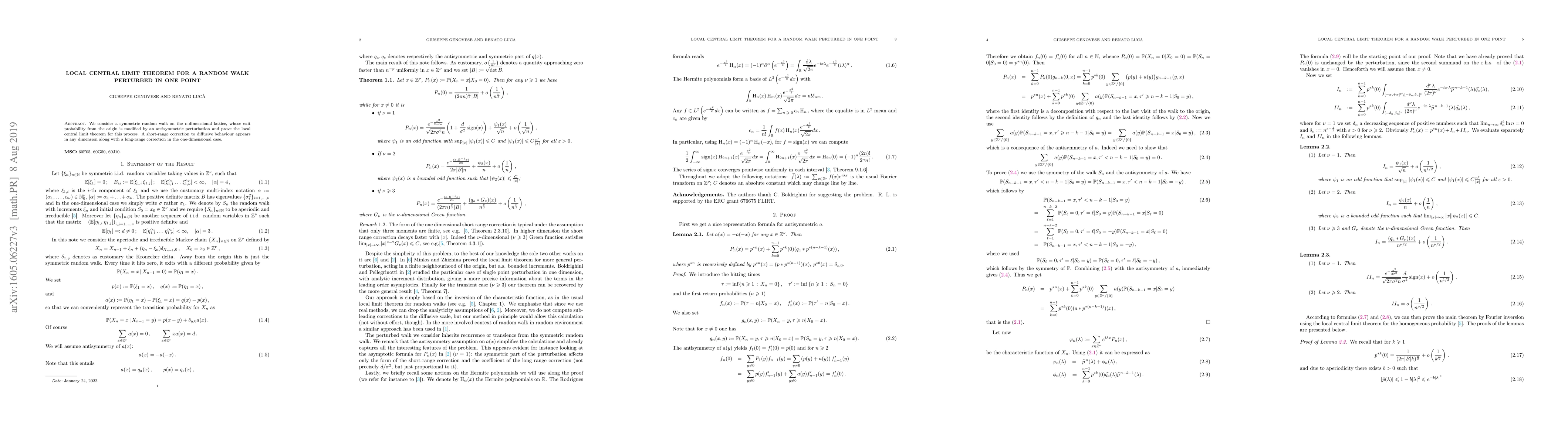 Summary: This paper proves the local central limit theorem for a perturbed symmetric random walk on a $\nu$-dimensional lattice, revealing short-range corrections to diffusive behavior in any dimension and a long-range correction specifically in one dimension.