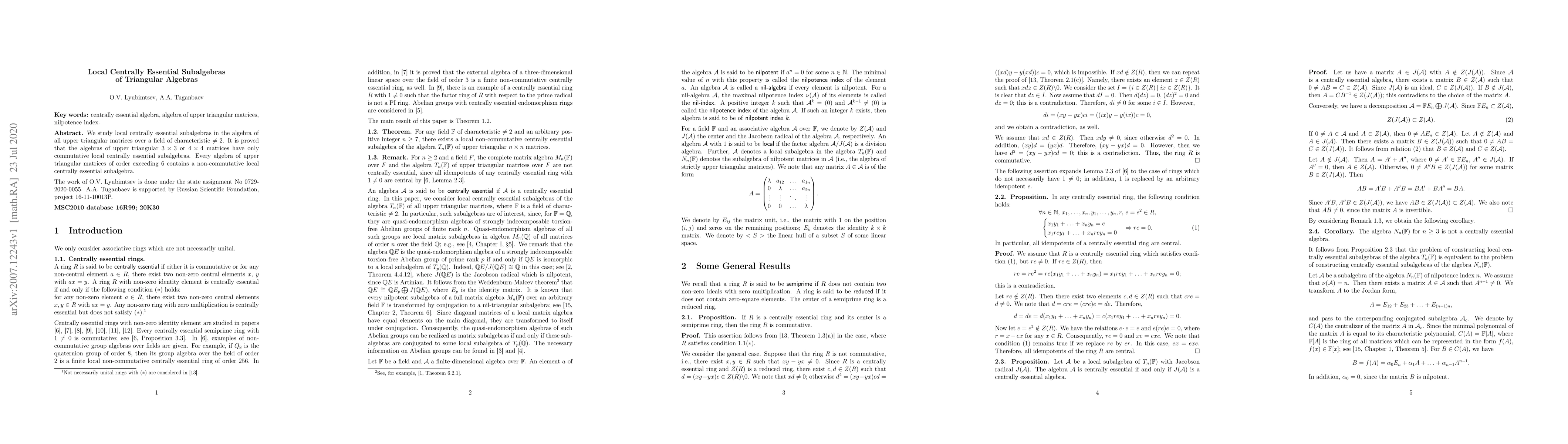 We study local centrally essential subalgebras in the algebra of all upper triangular matrices over a field of characteristic $\ne 2$. It is proved that the algebras of upper triangular $3\times 3$ or $4\times 4$ matrices have only commutative local centrally essential subalgebras. Every algebra of upper triangular matrices of order exceeding $6$ contains a non-commutative local centrally essential subalgebra. The paper will appear in Linear and Multilinear Algebra. The work of O.V. Lyubimtsev is done under the state assignment No~0729-2020-0055. A.A. Tuganbaev is supported by Russian Scientific Foundation, project 16-11-10013P.